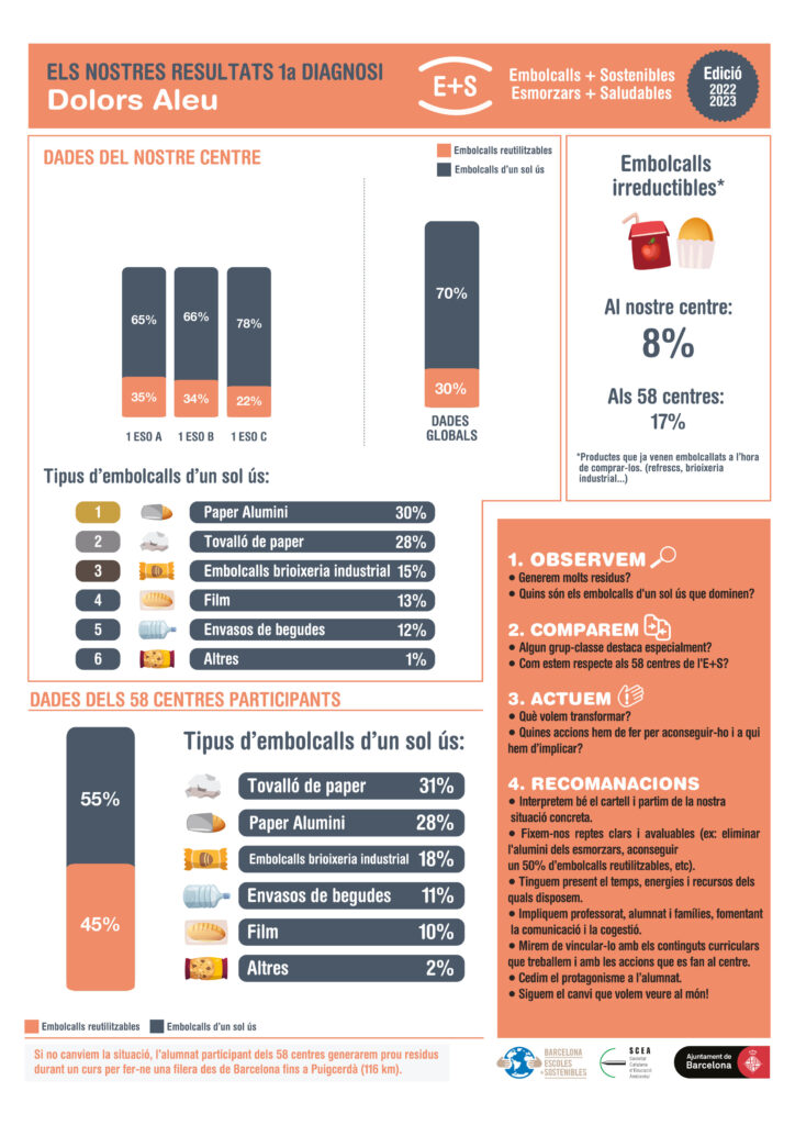 Com ja vam explicar a mitjans del 1r trimestre, l’Institut Dolors Aleu participa de la microxarxa Escoles + Sostenibles i en concret en el programa Embolcalls + Sostenibles, Esmorzars + Saludables. L’objectiu d’aquest programa és fomentar els esmorzars més saludables i la reducció dels envasos i embolcalls contaminants i d’un sol ús a partir d’un pla de prevenció. A mitjans del primer trimestre vam completar la primera fase del programa amb una primera diagnosi del tipus i la quantitat d’embolcalls que l’alumnat de 1r d’ESO utilitza a l’hora d’esmorzar; a la imatge en podeu veure els resultats.