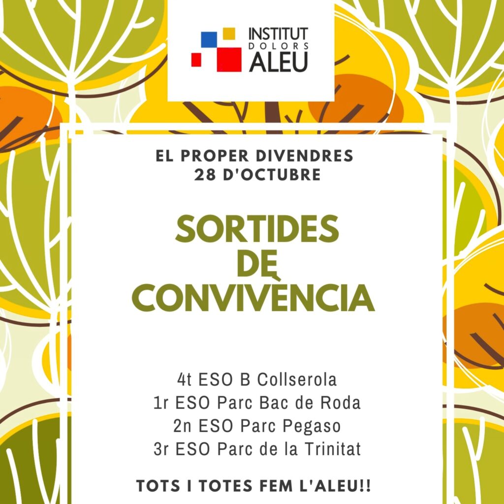 Aquest divendres 28 d’octubre es faran les sortides convivencials de l’alumnat de l’ESO. Seran les següents: