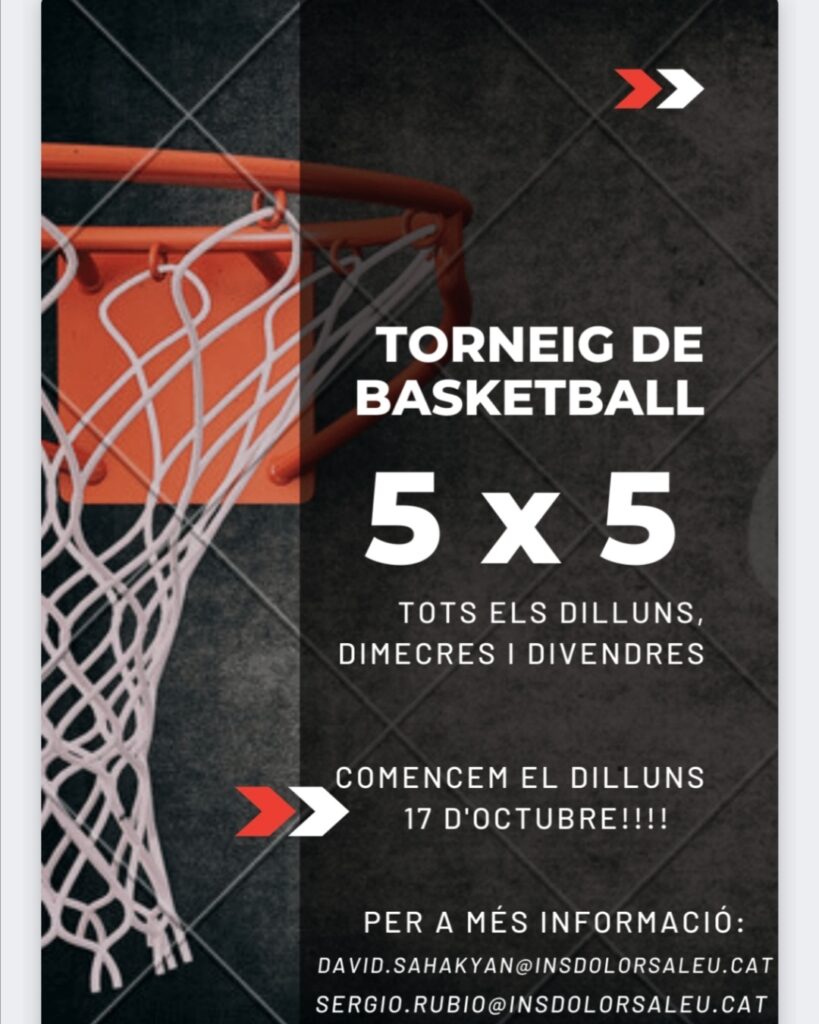 El proper dilluns 17 d’octubre arriba el primer torneig de bàsquet 5×5 a les pistes de l’Aleu. Cada dilluns, dimecres i divendres podreu jugar i gaudir dels partits. Per a més informació i per a inscriure-s’hi podeu contactar els alumnes de 3r d’ESO David Sahakyan (david.sahakyan@insdolorsaleu.cat) i el Sergio Rubio (sergio.rubio@insdolorsaleu.cat).
