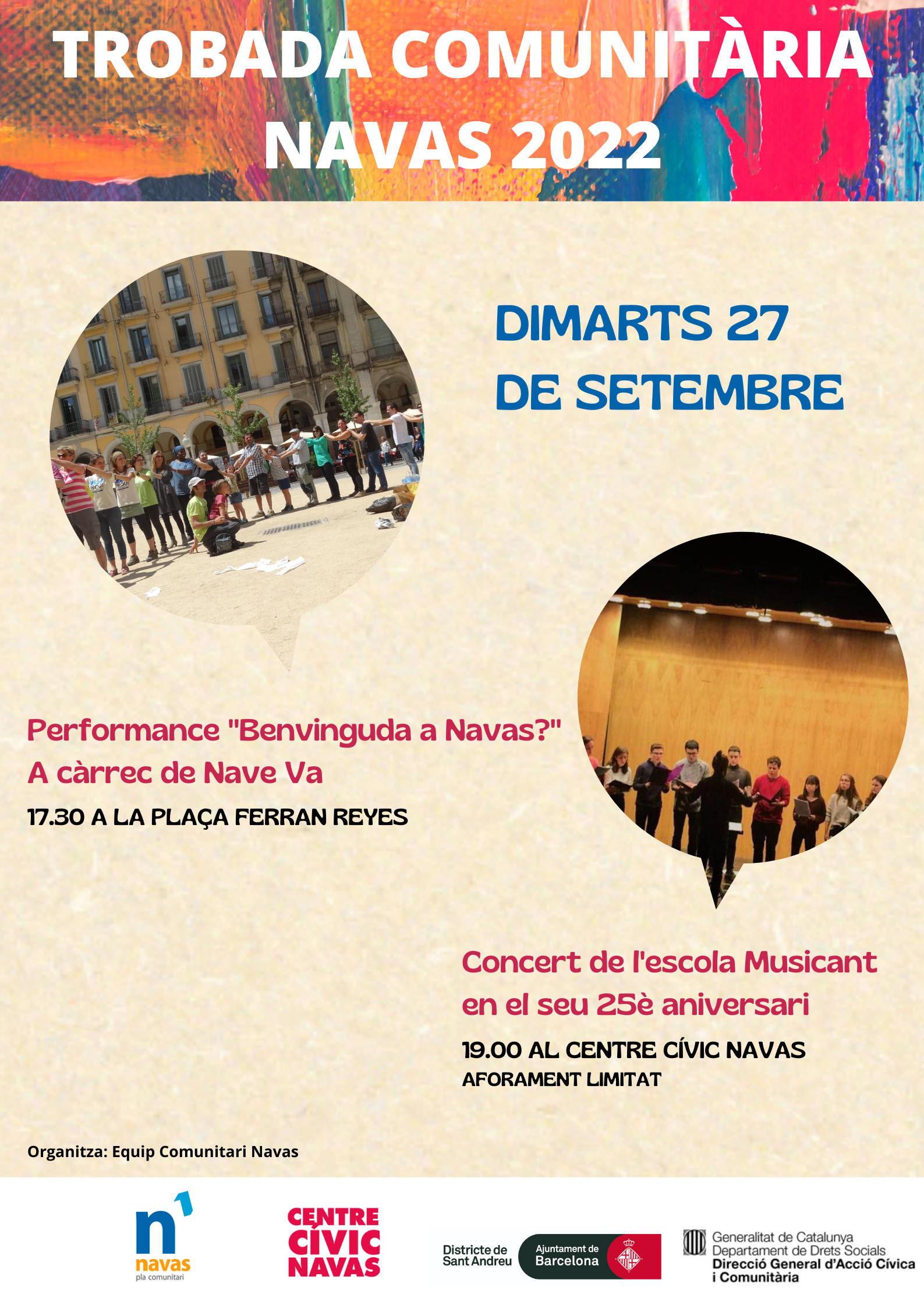 L’objectiu d’aquest acte és compartir un espai de trobada amb el barri mitjançant la música i el teatre i traslladar de manera creativa els reptes i necessitats que van sorgir al Diagnòstic que vam coordinar un grup de treball format per: Serveis Socials Garcilaso, INS Dolors Aleu, Comissió Jove, AVV, Centre Cívic Navas, CAP La Sagrera amb l’assessorament de l’Antonio Alcántara de La Perifèrica.
