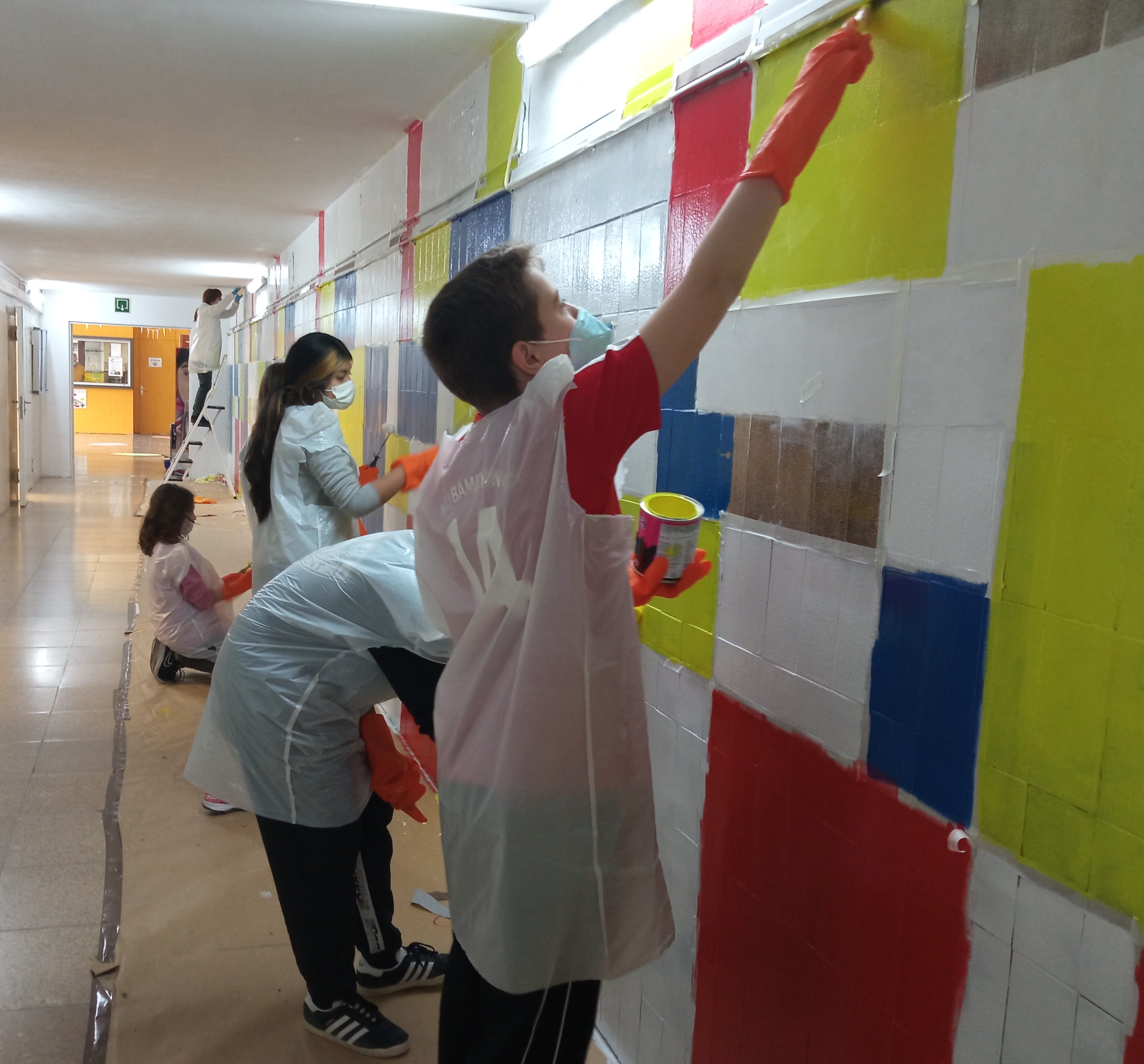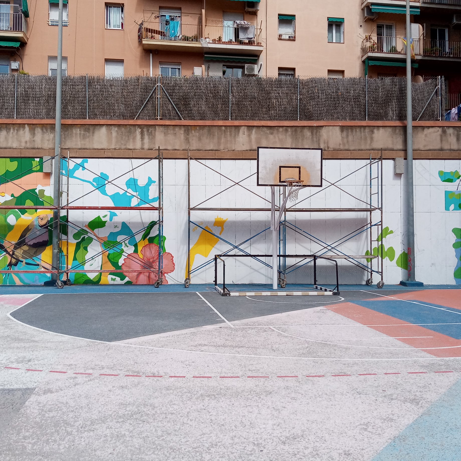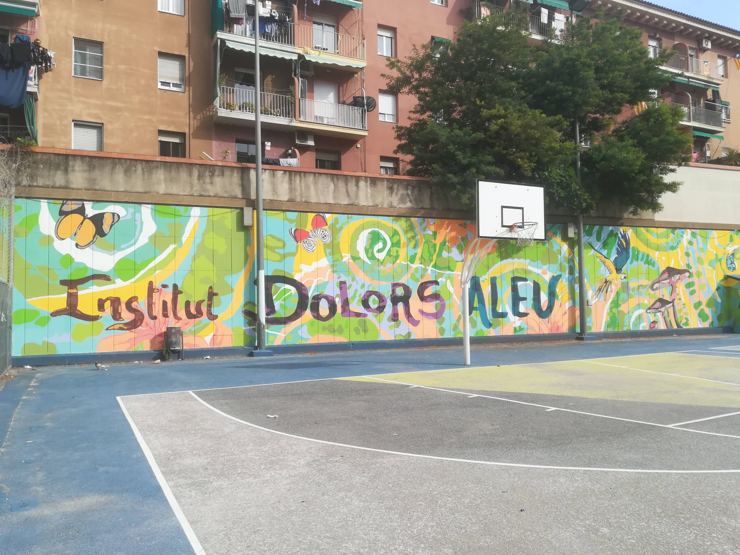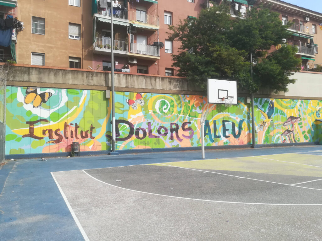 Mural a la zona de pistes del pati en col·laboració amb l’Escola d’Art i Disseny La Llotja