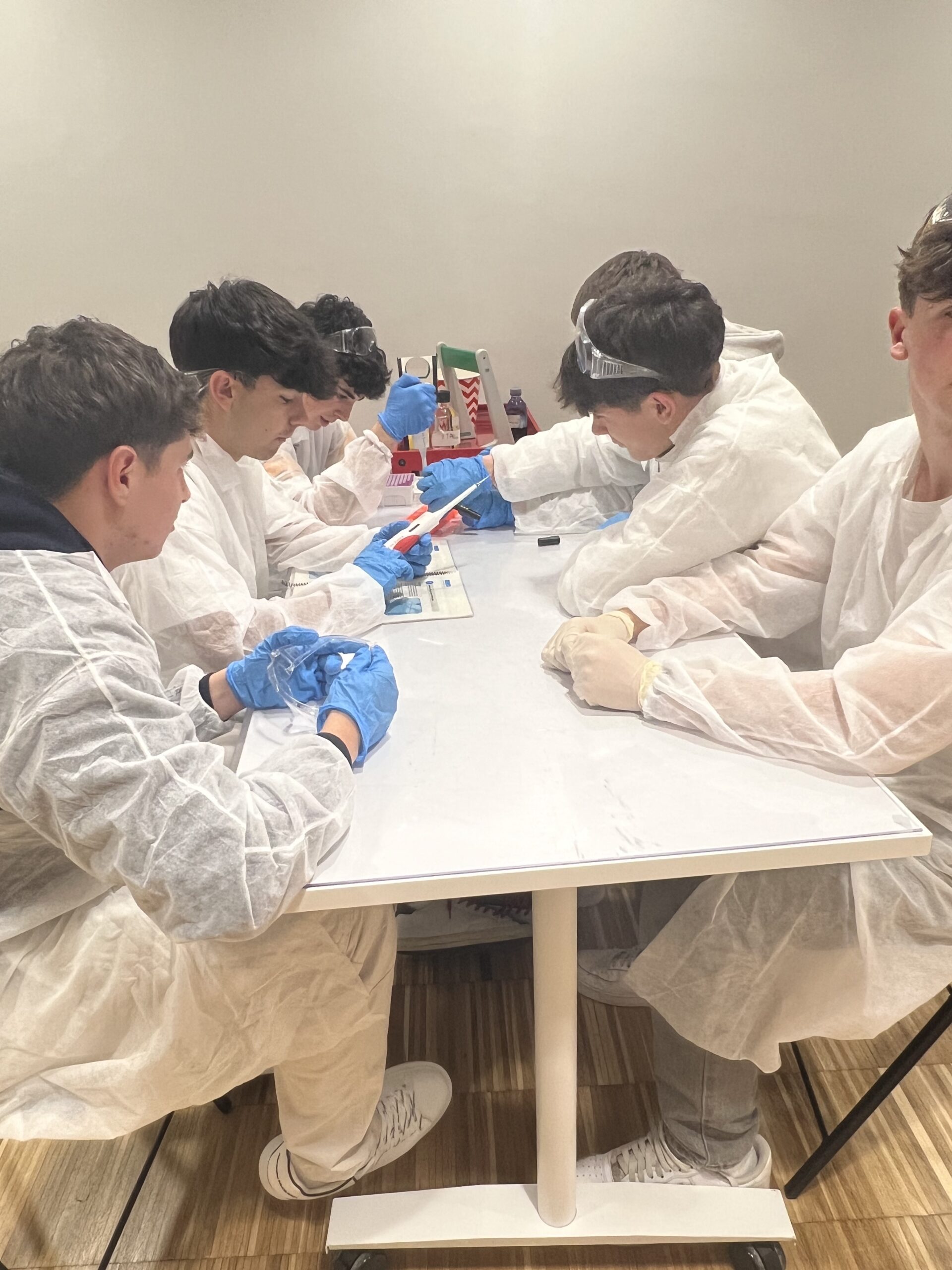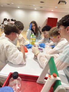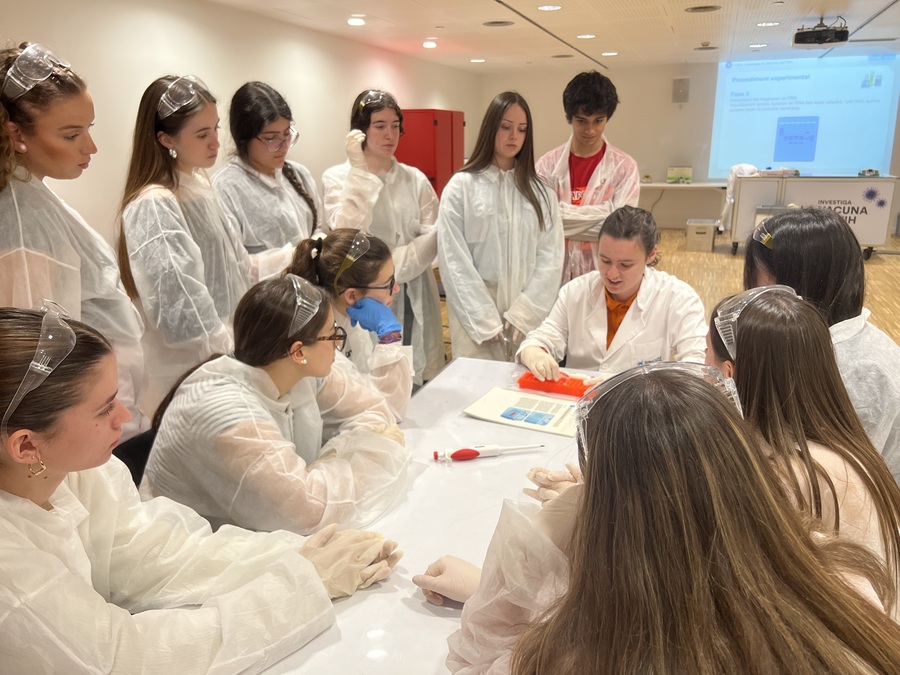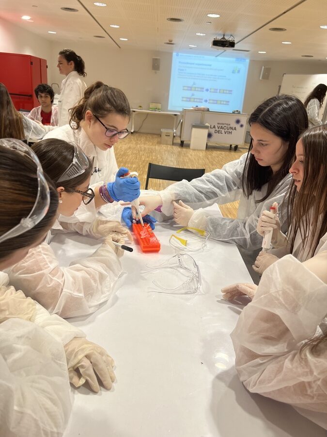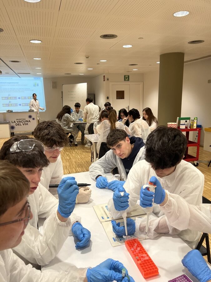 A més de visitar les instal·lacions del Museu de la Ciència CosmoCaixa de Barcelona, el passat 8 d’abril els alumnes de biologia de 1r de batxillerat van participar en el taller Com investigar la vacuna del VIH. En aquest taller se’ls ofereix l’oportunitat de reproduir una part de la investigació que es duu a terme als laboratoris de l’Institut d’Investigació de la Sida IrsiCaixa per identificar substàncies candidates a formar part d’una vacuna contra la Sida. El repte al qual s’enfronten els alumnes consisteix a esbrinar, seguint les etapes de la metodologia científica i utilitzant tècniques de laboratori, si una proteïna concreta del virus podria ser eficaç per eliminar la infecció per VIH.