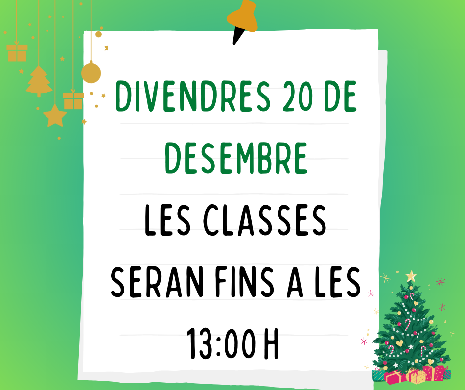 L’horari de l’alumnat d’ESO i Batxillerat d’aquest divendres serà de 08:30 h a 13:00 h coincidint amb l’últim dia de classes abans de vacances de Nadal. Per l’alumnat de Formació Professional l’horari serà de les 16:00 h a les 18:30 h. Abans de marxar, a la tarda, alumnat i professorat farà un avançament de les Campanades per desitjar-nos el millor per aquestes festes.