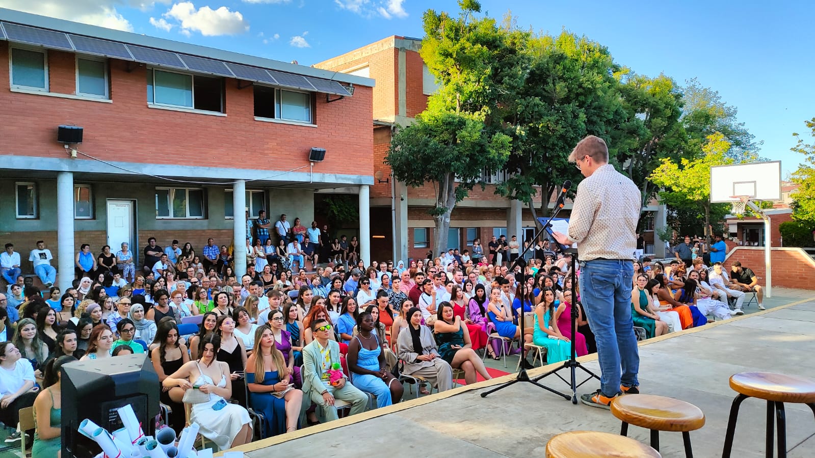 Els segons cursos dels CFGM d’Atenció a Persones en Situació de Dependència, CFGM de Gestió Administrativa, CFGS d’Educació Infantil i CFGS d’Administració i Gestió van tancar divendres passat el curs 23-24 al costat de l’alumnat del PFI d’Auxiliar en Centres Sanitaris, amb l’acte formal de graduació. La festa, conduïda per dos alumnes que es graduaven, va omplir el pati de l’Ínter d’alumnes i familiars, però també d’exalumnes del centre que van aprofitar per saludar l’equip docent, amistats i coneguts del centre. Com cada curs, també alguns alumnes que l’any que ve es graduaran no van voler perdre’s la festa.
