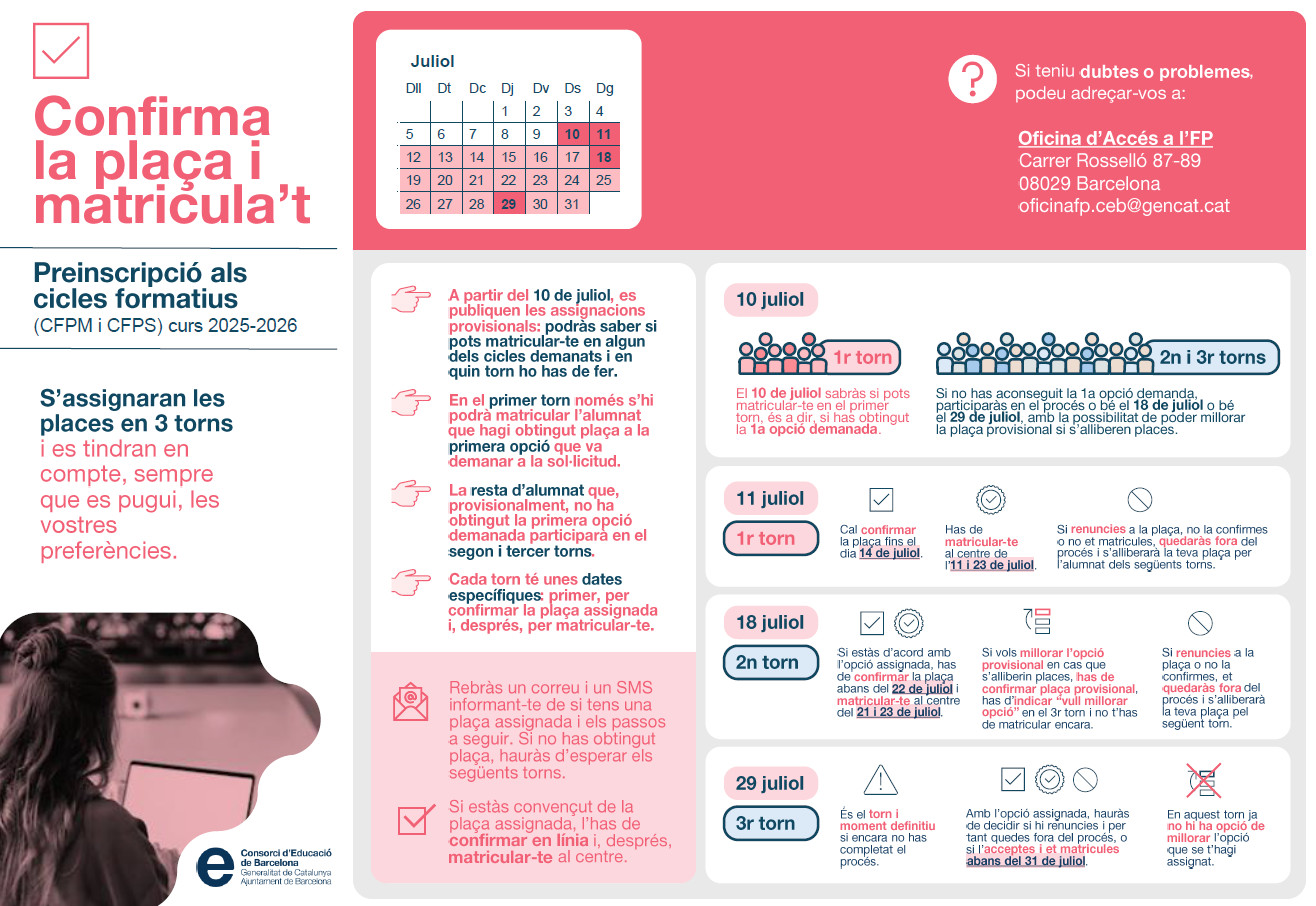 - Període de confirmació de matrícula online de la segona assignació: Del 21 al 22 de juliol de 2025.