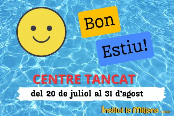 VACANCES D’ESTIU! Aquí podeu veure i descarregar el calendari d’inici de curs. Fins el dia 19 de juliol estem al centre. A partir del dia 2 de setembre tornem a obrir el centre. Horaris REUNIÓ DE FAMÍLIES al setembre.