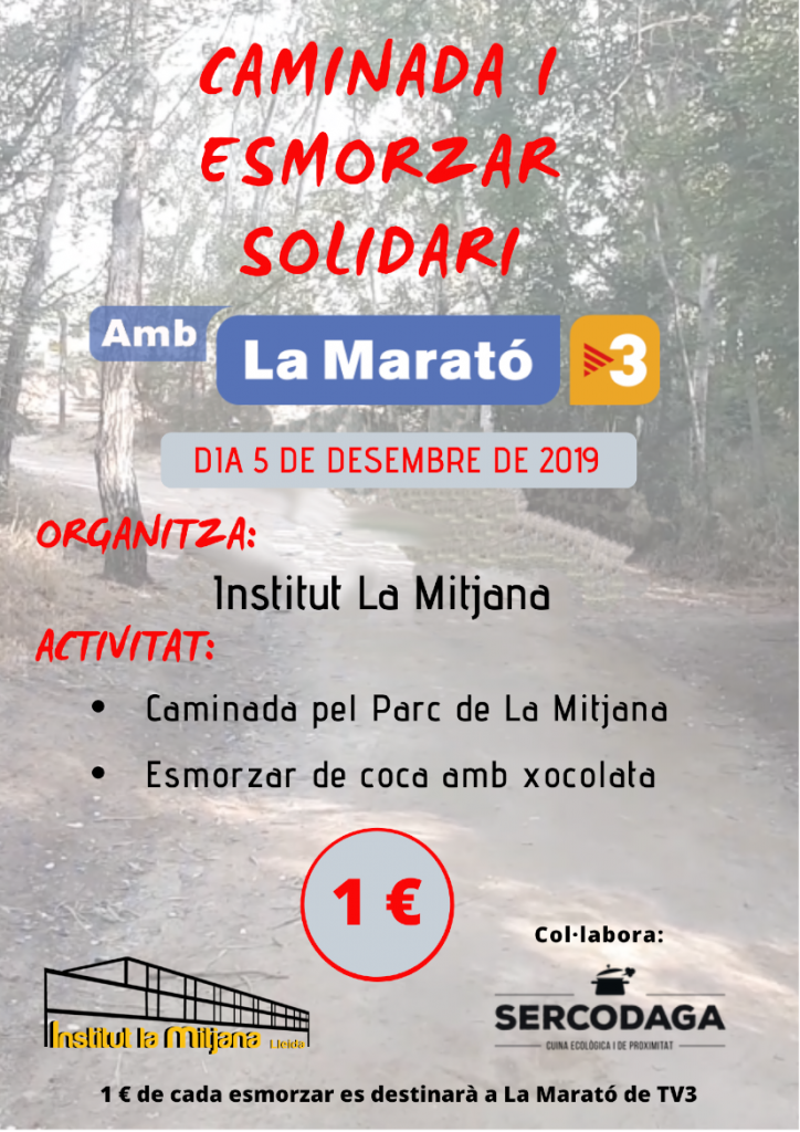 Un any més, el nostre centre col·labora amb La Marató. L’activitat que durem a terme serà una caminada pel Parc de La Mitjana, a més d’un esmorzar solidari de coca amb xocolata. Per participar-hi l’alumnat haurà d’aportar 1 € que es destinarà a La Marató. Agraïm la col·laboració de l’empresa Sercodaga.