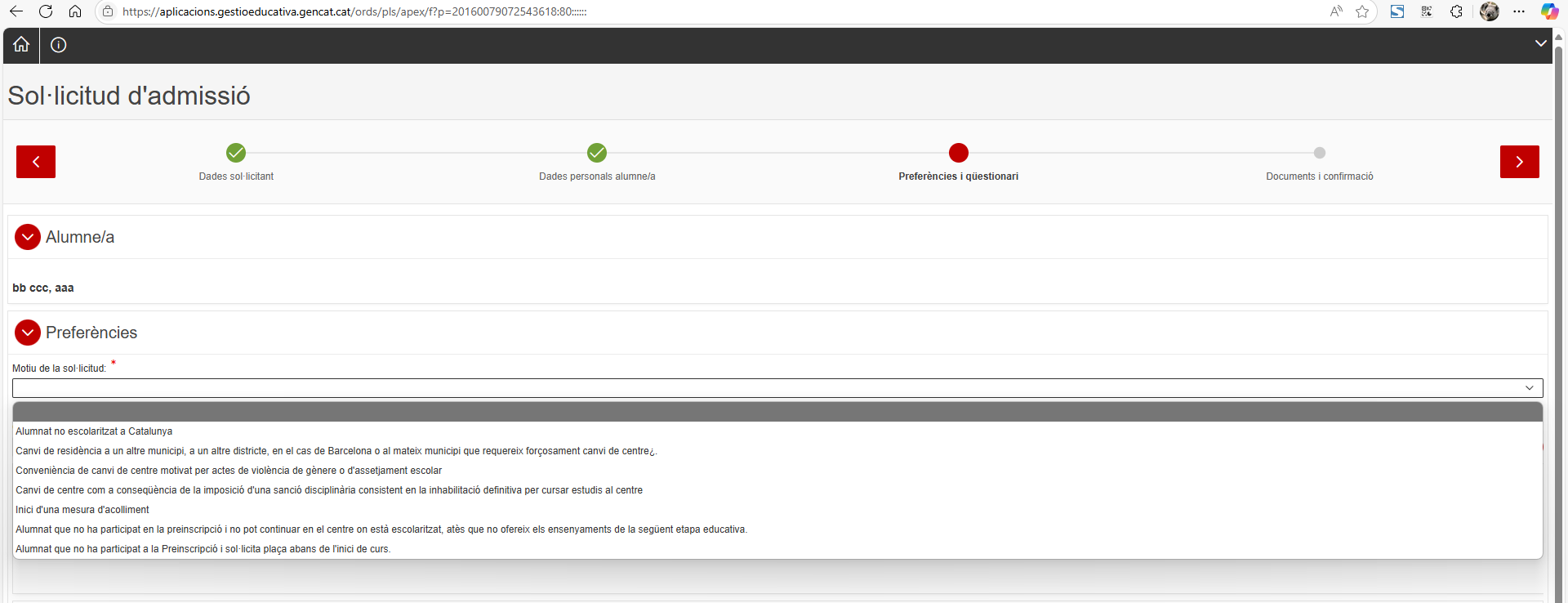 Al pas 3 “Preferències i qüestionari” del formulari de la sol·licitud de preinscripció, heu d’escollir el valor “2025-2026” al camp “Curs escolar“, i el valor “Alumnat que no ha participat a la Preinscripció i sol·licita plaça abans de l’inici de curs” al camp “Motiu de la sol·licitud”.
