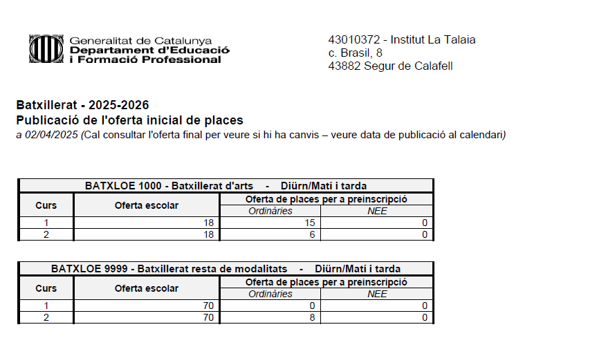 El dia 02.04.2025 s’ha publicat l’oferta inicial de places per al Batxillerat a l’Institut La Talaia per al curs 2025-2026.