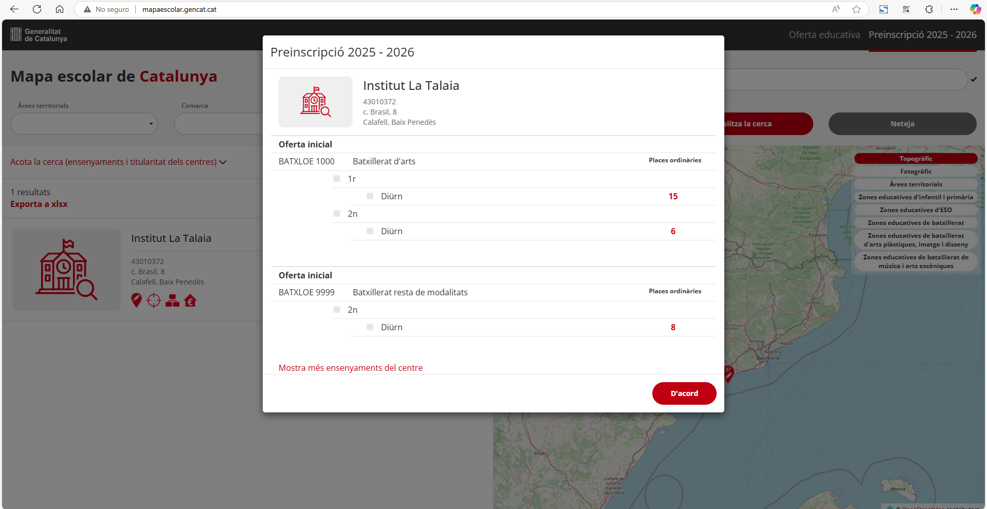 Podeu consultar l’oferta de places al Batxillerat per al curs 2025/2026 al lloc web mapaescolar.gencat.cat, introduint el text “Talaia” al cercador, i al resultat que us apareix, fent clic al botó que mostra una casa vermella que conté el símbol €.