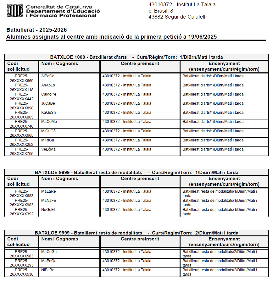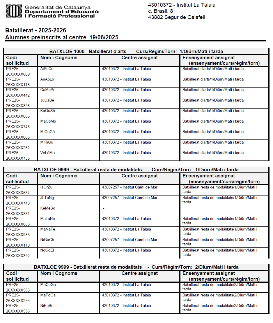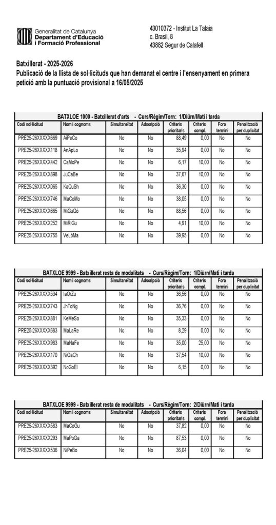 Llista d’alumnes preinscrits a l’Institut La Talaia, amb indicació de de l’assignació, al Batxillerat, per al curs 2025-2026: