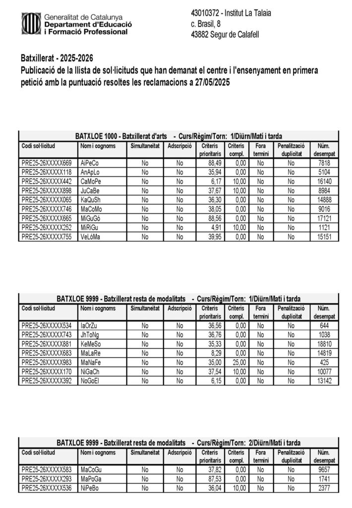 Llista de sol·licituds que han demanat l’Institut La Talaia i l’ensenyament de Batxillerat en primera petició amb la puntuació resoltes les reclamacions, per al curs 2025-2026.