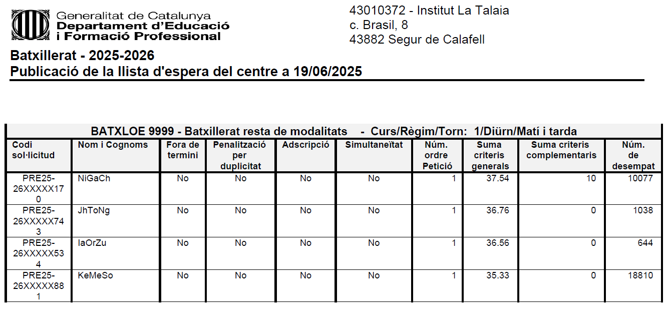 Llista d’espera a l’Institut La Talaia, al Batxillerat, per al curs 2025-2026: