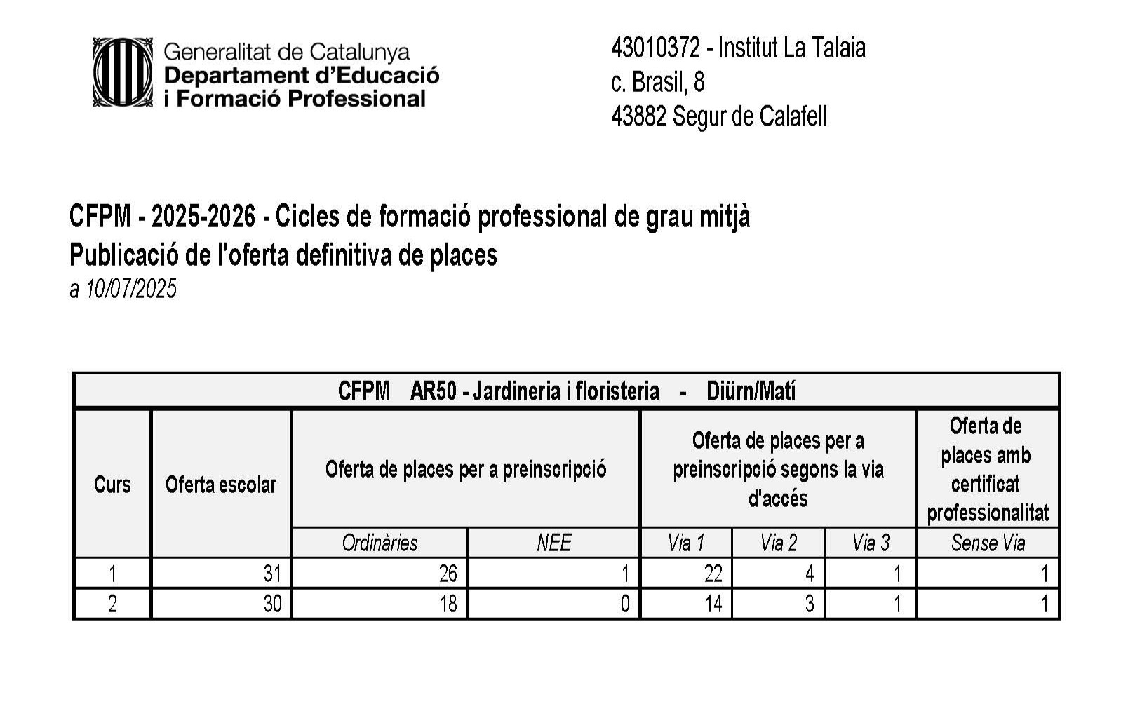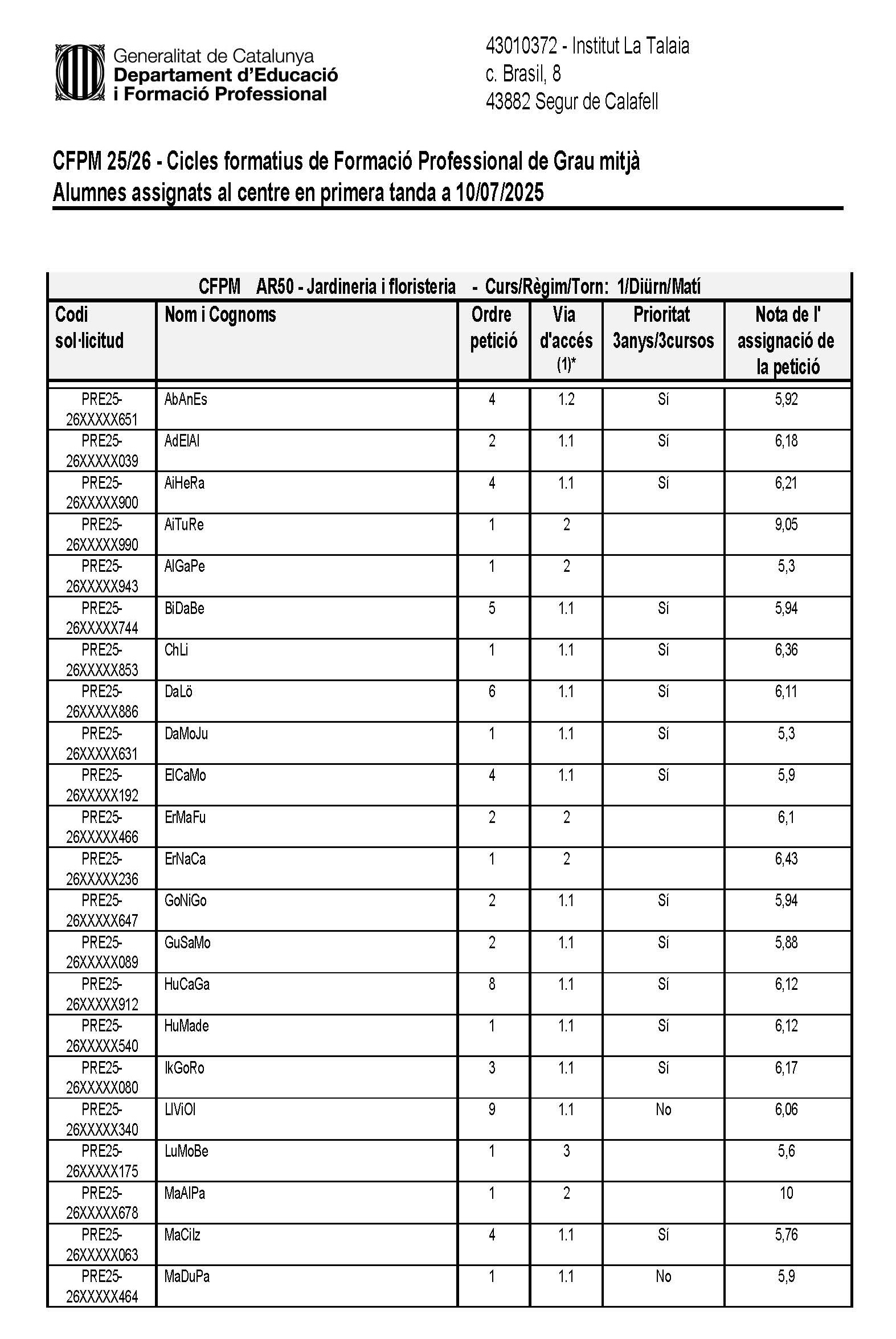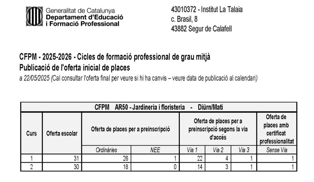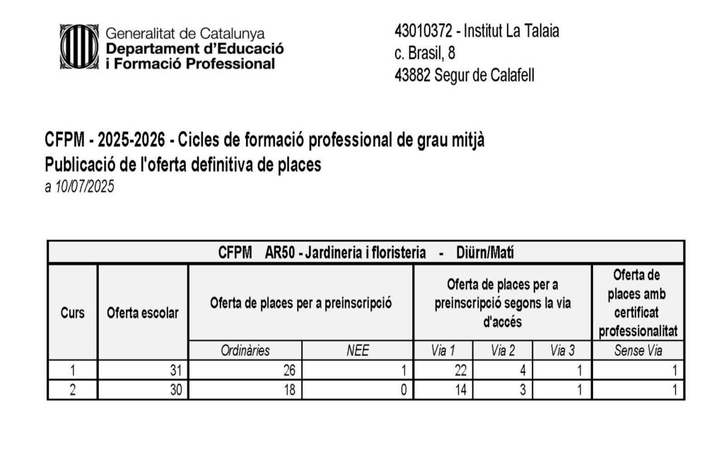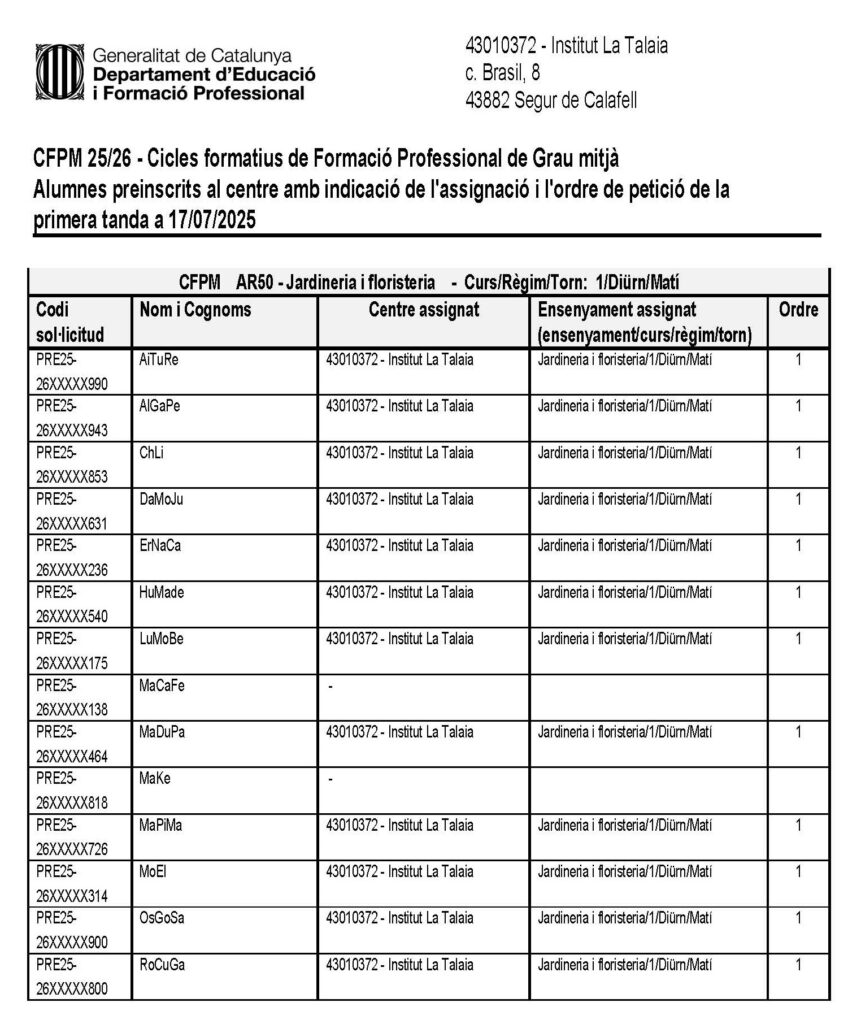 El dia 10.07.2025 s’ha publicat al tauler d’anuncis del centre la llista d’alumnes assignats a l’Institut La Talaia i l’ensenyament CFGM de Jardineria i floristeria en primera tanda, per al curs 2025-2026.