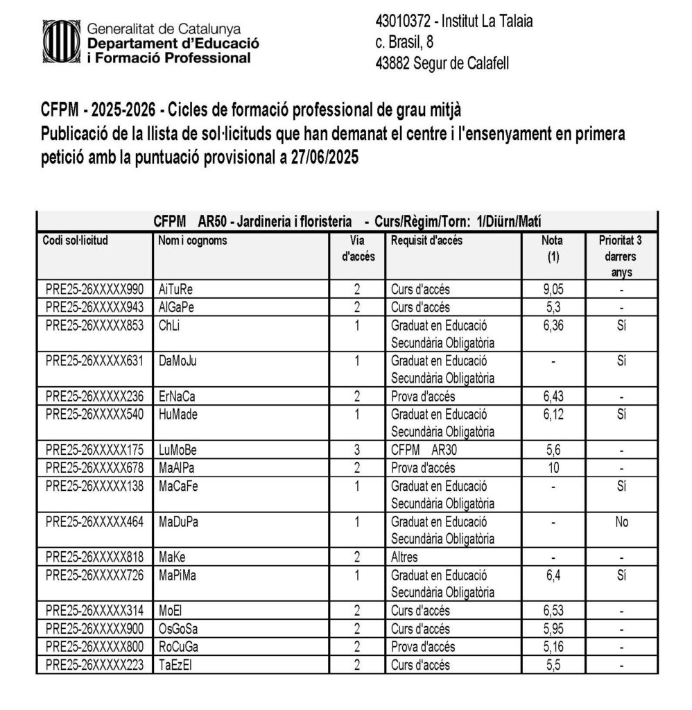 El dia 27.06.2025 s’ha publicat al tauler d’anuncis del centre la llista de sol·licituds que han demanat l’Institut La Talaia i l’ensenyament CFGM de Jardineria i floristeria en primera petició amb la puntuació provisional, per al curs 2025-2026.