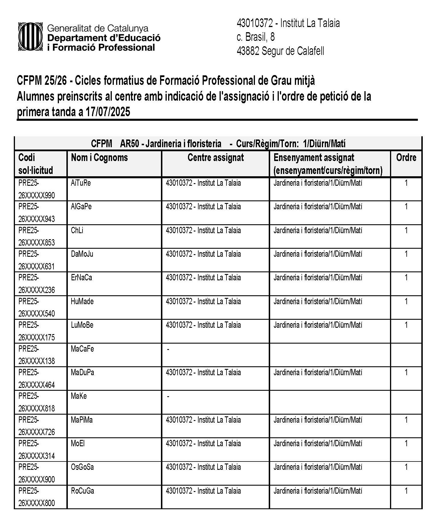 Llista d’alumnes preinscrits a l’Institut La Talaia i l’ensenyament CFGM de Jardineria i floristeria amb indicació de l’assignació i l’ordre de petició de la primera tanda a 17/07/2025, per al curs 2025-2026.