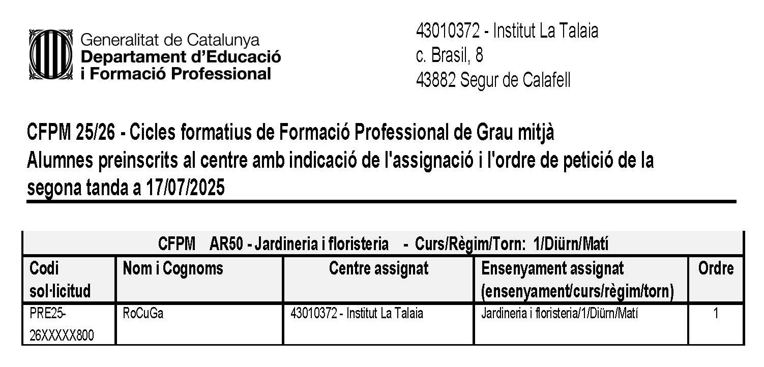 El dia 17.07.2025 s’ha publicat al tauler d’anuncis del centre la llista d’alumnes assignats a l’Institut La Talaia i l’ensenyament CFGM de Jardineria i floristeria en segona tanda, per al curs 2025-2026.