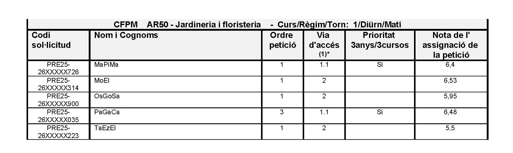 Llista de sol·licituds que han demanat l’Institut La Talaia i l’ensenyament CFGM de Jardineria i floristeria en primera petició amb la puntuació provisional, per al curs 2025-2026