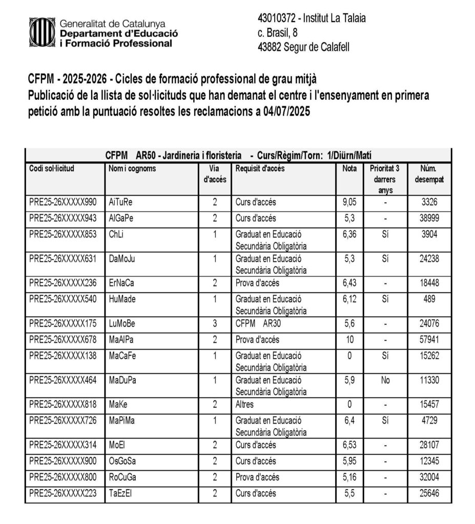 El dia 07.07.2025 s’ha publicat al tauler d’anuncis del centre la llista de sol·licituds que han demanat l’Institut La Talaia i l’ensenyament CFGM de Jardineria i floristeria en primera petició amb la puntuació resoltes les reclamacions, per al curs 2025-2026.