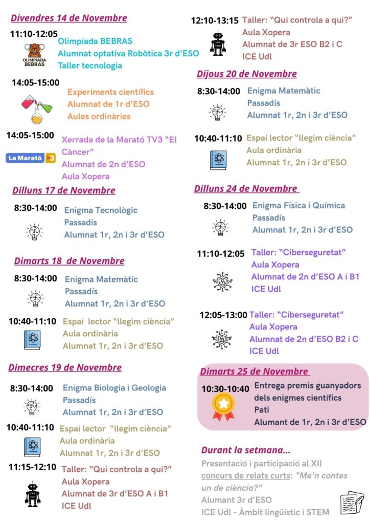 Aquesta setmana iniciem la 30a Setmana de la Ciència. Amb aquest motiu, compartim amb vosaltres el conjunt d’activitats que s’han organitzat al centre per a tot l’alumnat, amb l’objectiu d’apropar-los al món científic, despertar la curiositat i fomentar les vocacions científiques.
