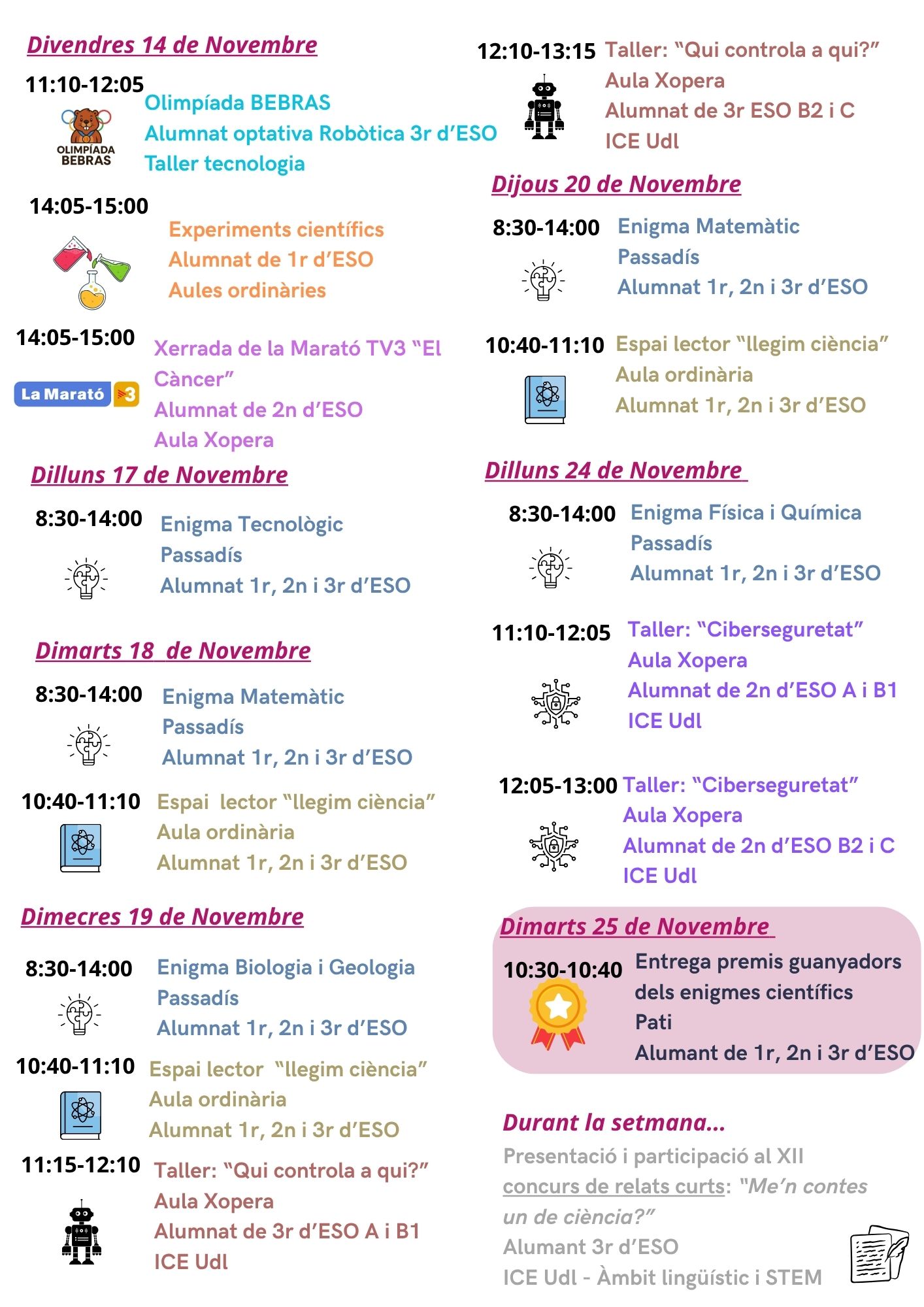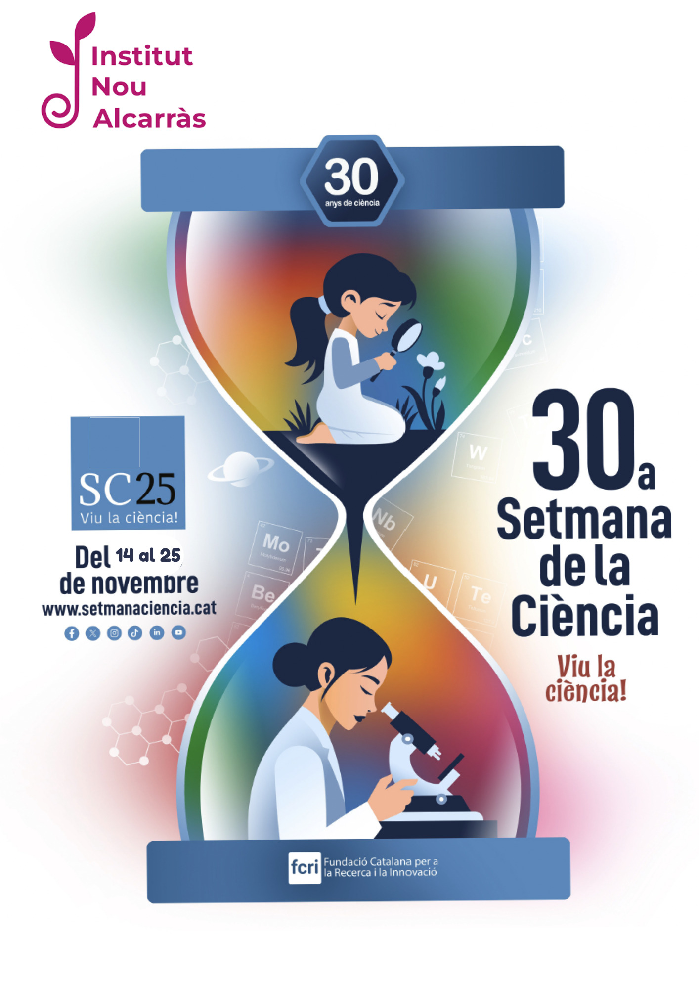Aquesta setmana iniciem la 30a Setmana de la Ciència. Amb aquest motiu, compartim amb vosaltres el conjunt d’activitats que s’han organitzat al centre per a tot l’alumnat, amb l’objectiu d’apropar-los al món científic, despertar la curiositat i fomentar les vocacions científiques.