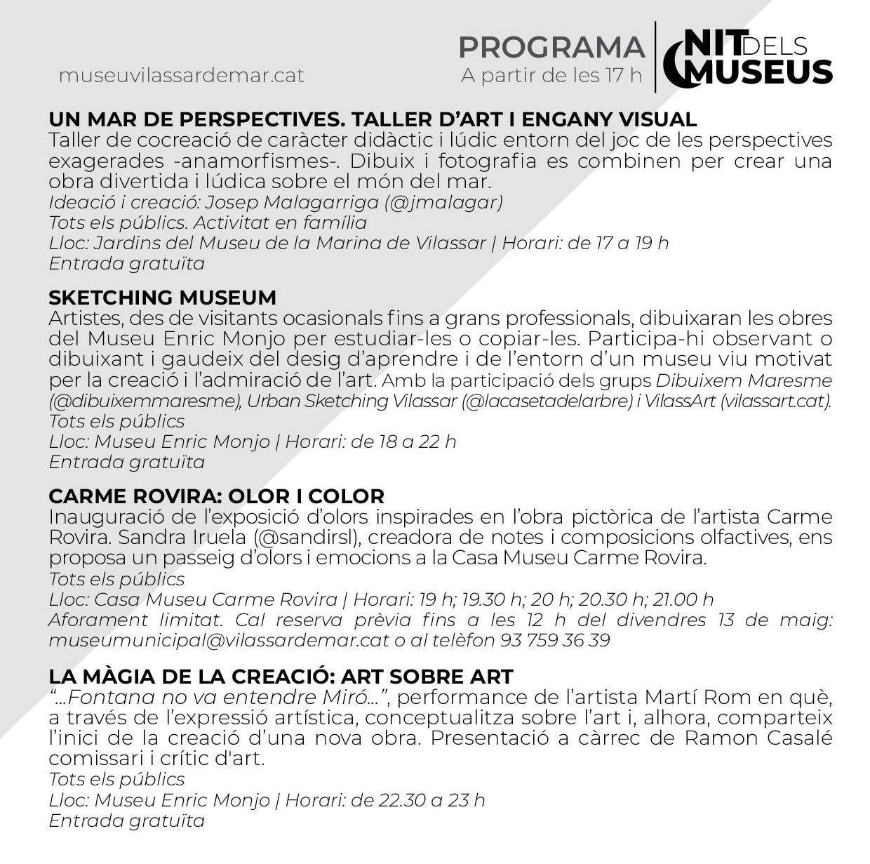 Durant el dissabte 14 de maig, l’Ajuntament organitza la Nit dels Museus de Vilassar de Mar. Una colla d’activitats per gaudir de la cultura. Els actes principals són: