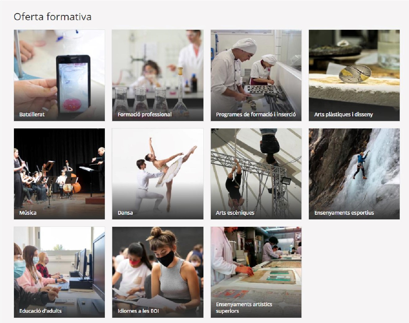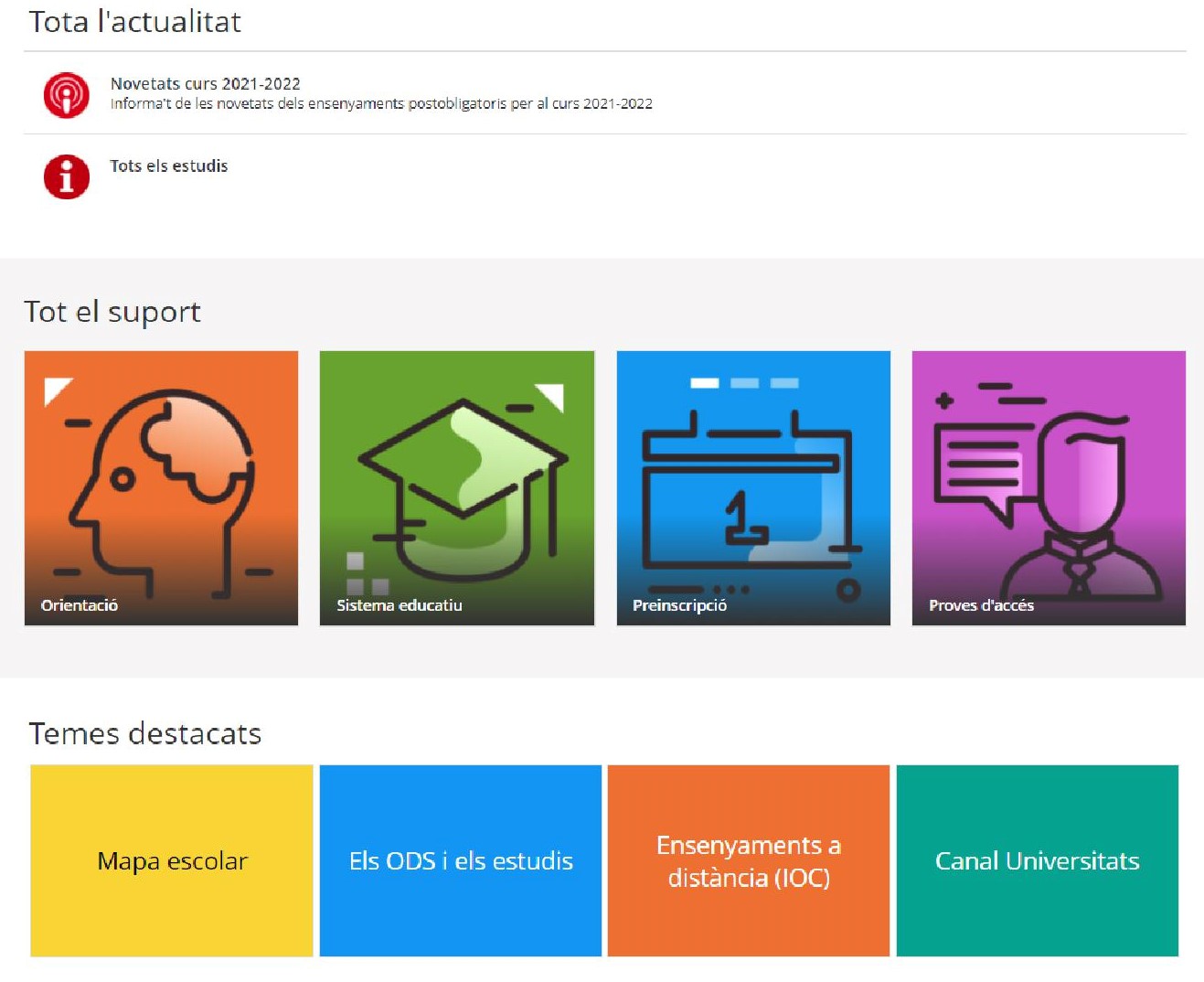 El nou web és responsiu i, per tant, es pot consultar des de qualsevol dispositiu mòbil. El portal inclou les fitxes actualitzades de tots els estudis, d’acord amb els canvis introduïts arran de l’entrada en vigor de la nova llei d’Educació, la LOMLOE, el 19 de gener passat. A més, hi trobareu vídeos explicatius sobre els diferents estudis, podcasts sobre temes diversos (proves d’accés a ensenyaments d’arts escèniques i esportius, novetats del proper curs, recomanacions per fer un bon treball de recerca…), un desplegable descarregable que reuneix tota la informació sintetitzada sobre l’oferta formativa, i molts altres materials. El menú superior incorpora un botó de traducció automàtica que facilita la navegació per tot el web en català, castellà, occità-aranès, anglès, francès, italià, portuguès, alemany, rus, urdú, àrab i xinès.