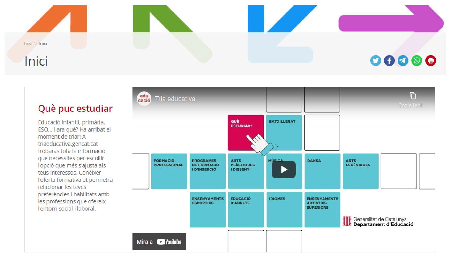 El Departament d’Educació de la Generalitat de Catalunya posa en marxa el nou web temàtic triaeducativa.gencat.cat, que neix amb un objectiu principal: oferir informació de qualitat i actualitzada als nois i noies que acaben l’ESO i han de decidir quina formació s’ajusta més als seus interessos i a la posterior sortida laboral. Aquest nou portal temàtic veu la llum en el context de pandèmia per la covid-19, que per segon any consecutiu impedeix la participació del Departament en un esdeveniment presencial tan vinculat al suport i l’acompanyament als nostres joves com és el Saló de l’Ensenyament. L’any passat, per aquestes dates, i un cop constatada la impossibilitat que l’edició del Saló en què s’estava treballant feia mesos veiés la llum, es va fer l’esforç, contra rellotge, d’arribar al període previ a la preinscripció als ensenyaments postobligatoris amb l