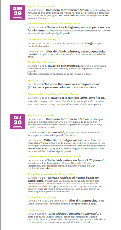 De totes elles destaquem la concentració d’activitats que farem dissabte dia 25 de març al recinte de l’Escola Pérez Sala, amb la FESTA DE LA SALUT, de les 10.00 a les 21.00 h. Marató de donació de sang, activitats per als més menuts i les més menudes i també per als i les joves. Tot de tallers i d’activitats lúdiques que mitjançant la diversió pretenen promoure estils de vida saludables.
