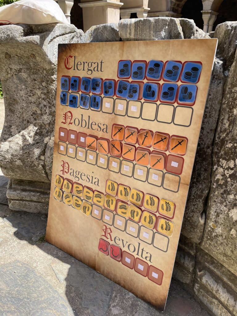 En funció de les seves decisions, guanyaven o perdien targetes de monedes (diners), espases (armament) o blat (menjar). Cada decisió es prenia en una estància diferent del monestir, d’aquesta manera van poder visitar diferents espais com el claustre o l’església.