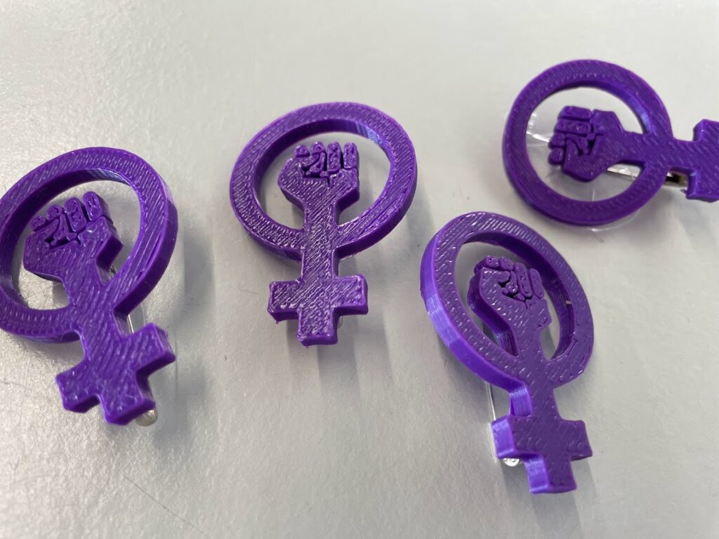 A més, a més, des del Departament de Tecnologia, les docents Aurora Pla i Anna Valls, amb la col·laboració dels alumnes de 1r i 3r d’ESO, han elaborat un pin reivindicatiu amb impressora 3D.