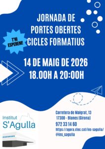 Aquesta jornada ofereix una oportunitat excel·lent per conèixer en profunditat l’oferta educativa, les instal·lacions i l’equip docent del nostre centre. Us animem a participar-hi i resoldre tots els dubtes sobre els estudis de Cicles Formatius a l’Institut S’Agulla.