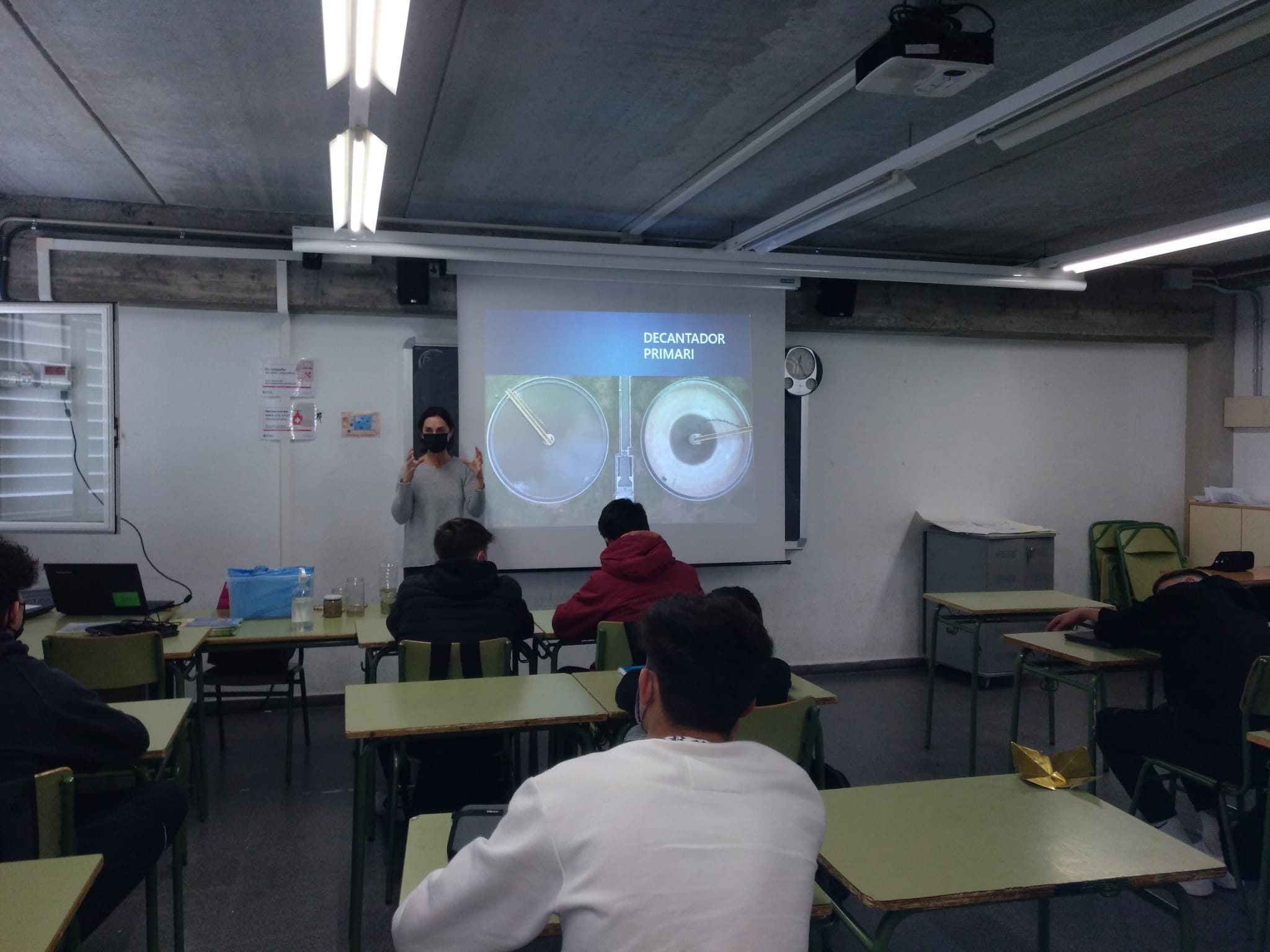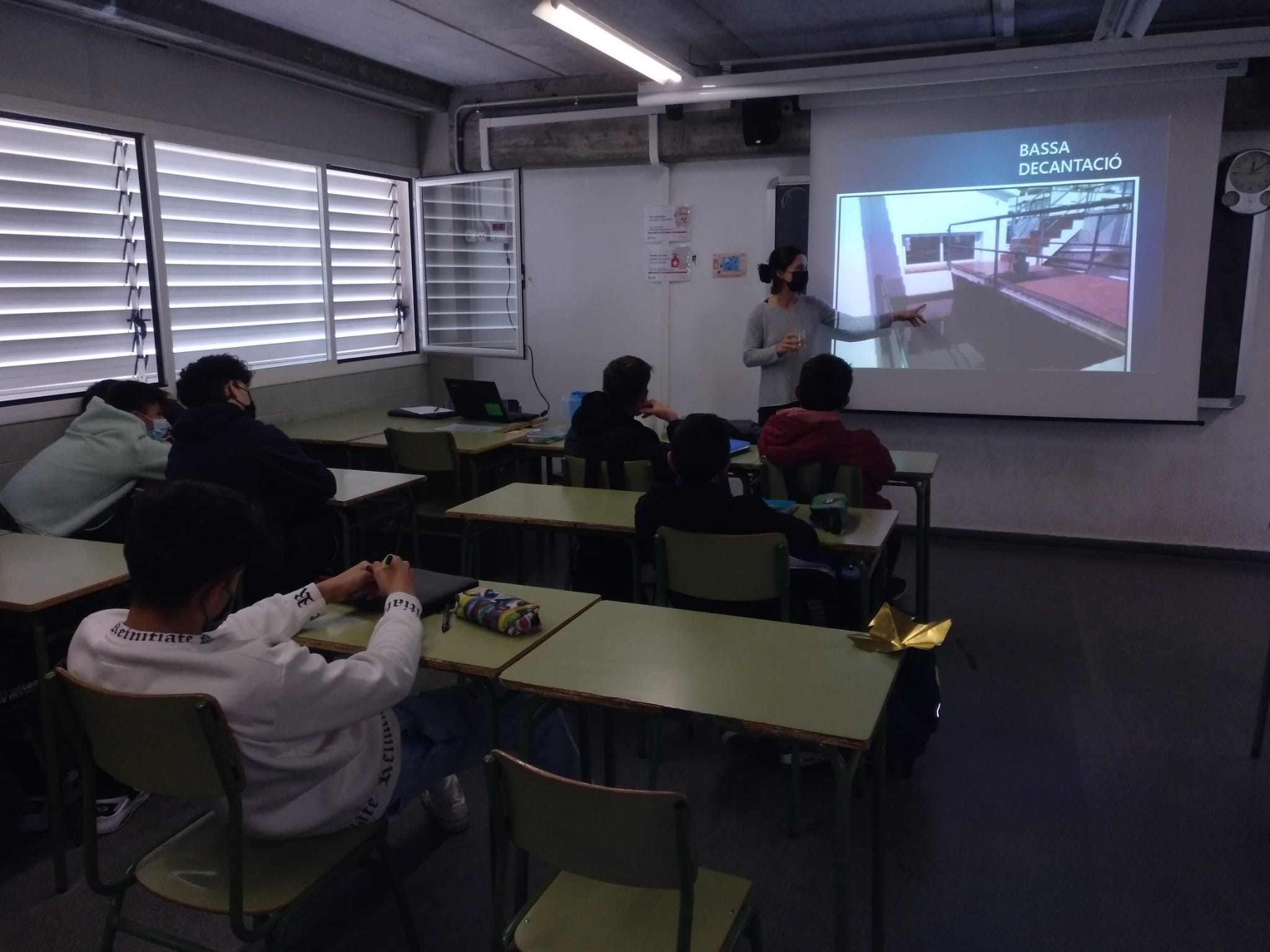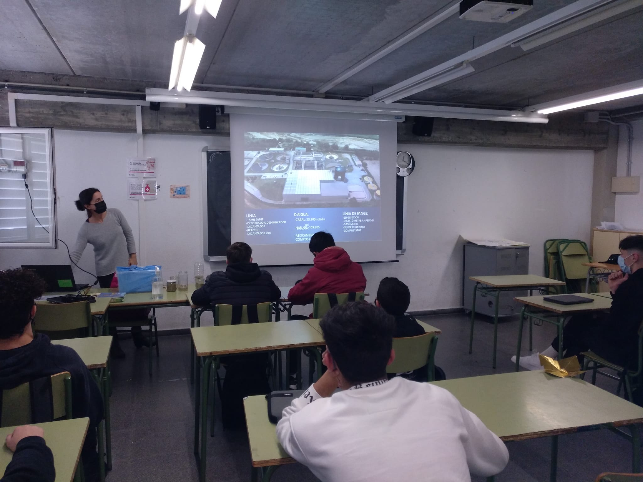 La Sònia Martí, de La Copa SCC, la cooperativa d’educació ambiental a les comarques gironines, va venir a fer una xerrada sobre el tractament d’aigües residuals i fangs de la depuradora (EDAR) de Blanes al trenta-tres nois i noies que formen l’alumnat de l’itinerari tecnològic de 4rt d’ESO.