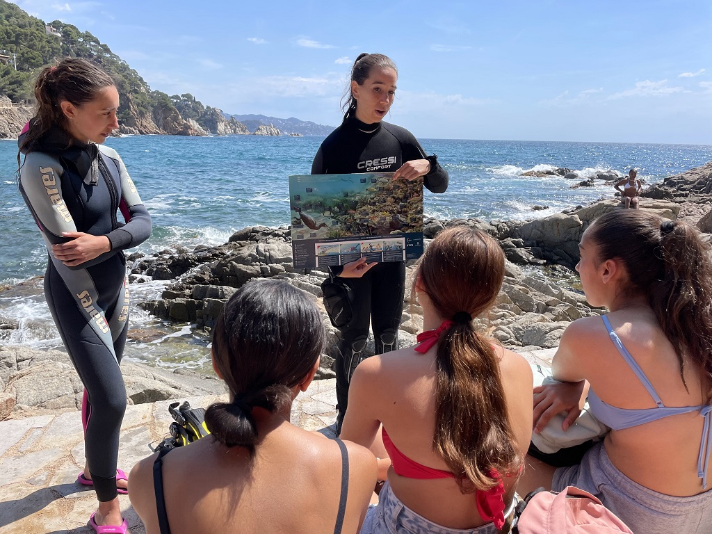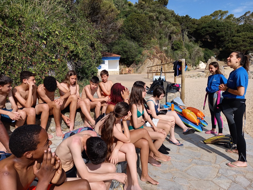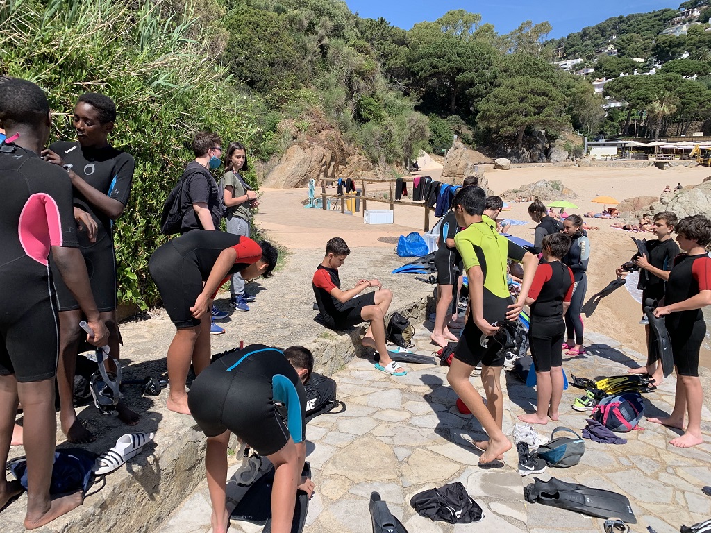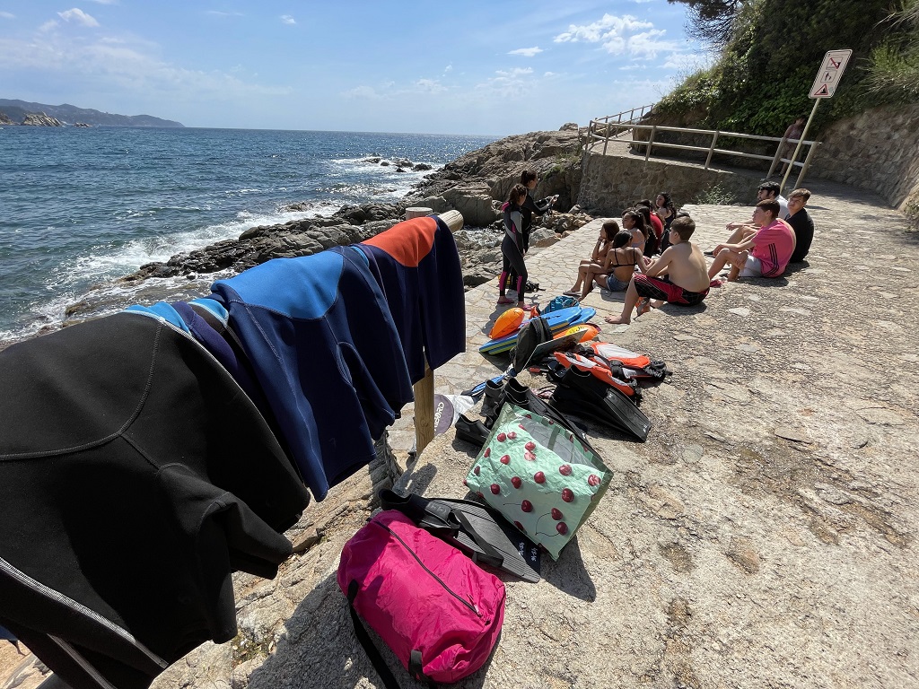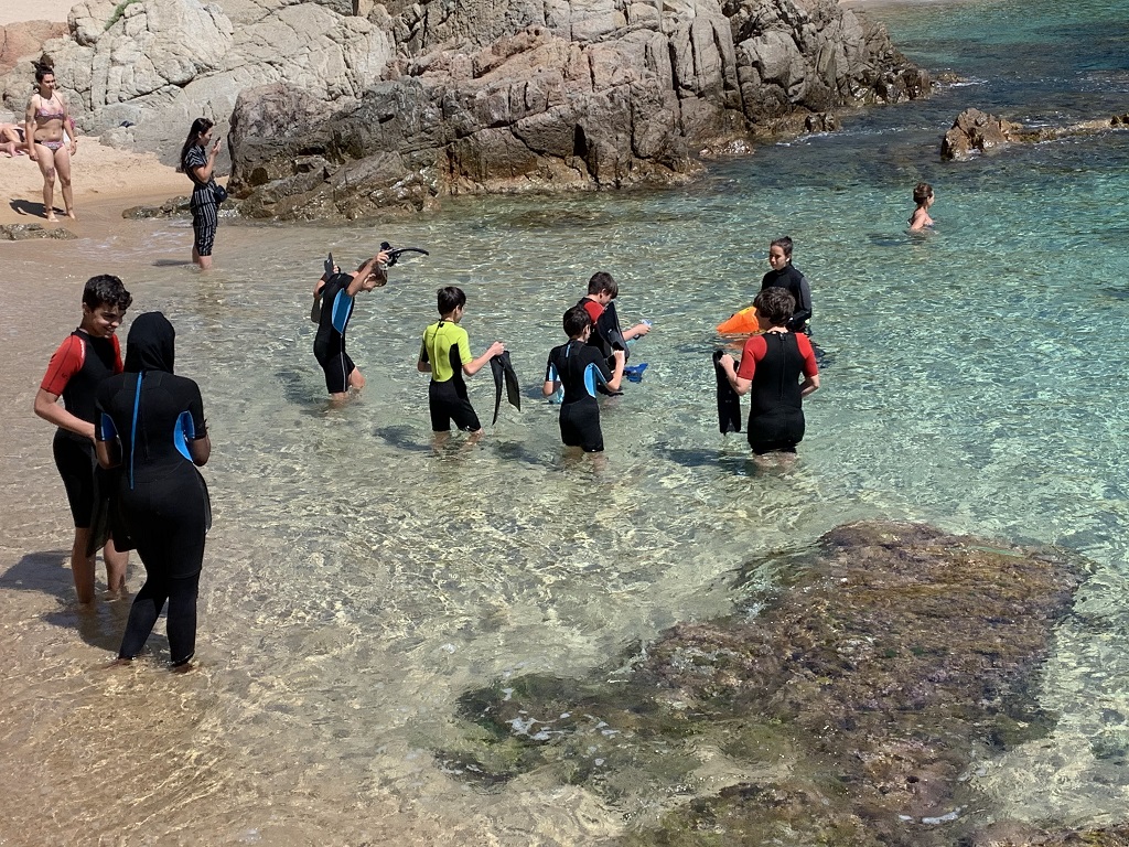 L’altre grup va seguir caminant pel camí de ronda fins arribar a la Cala Sant Francesca. Allà els van explicar quines eren les principals espècies animals que habiten a les nostres costes, i després d’algunes indicacions, es van posar el neoprè, el tub, les ulleres i les aletes, i van poder veure algunes animals com esponges de mar, eriçons de roca o cogombres de mar.