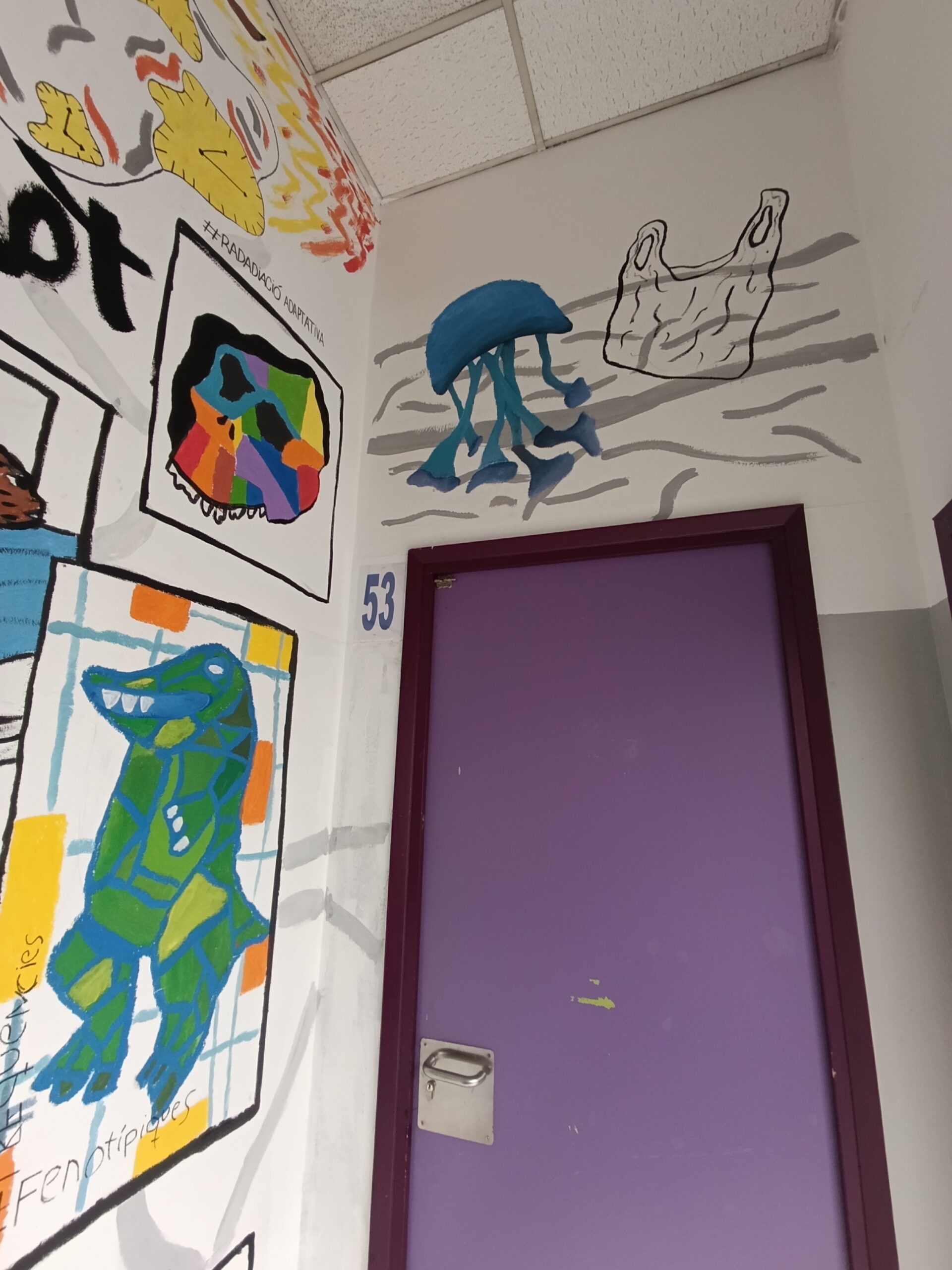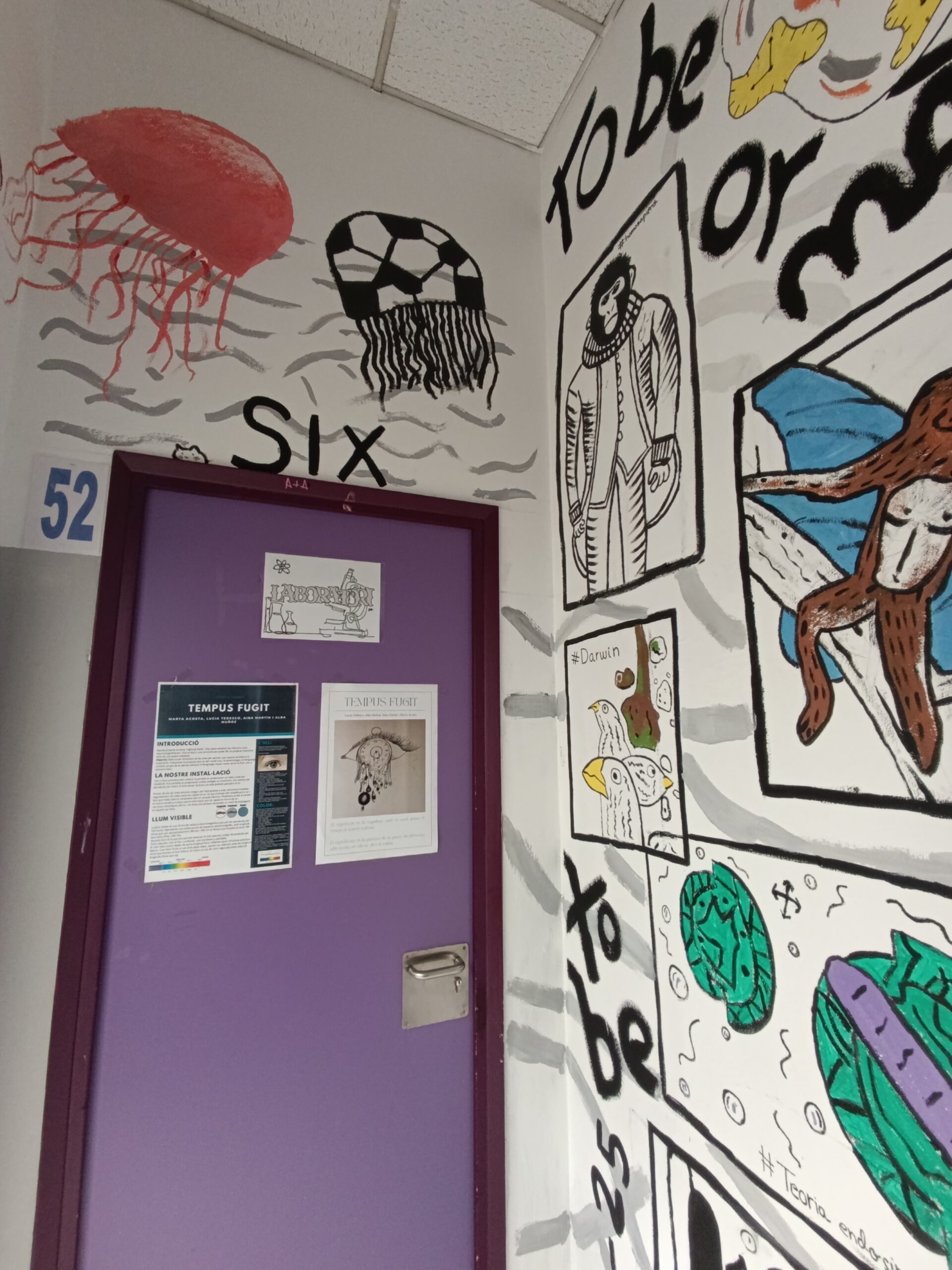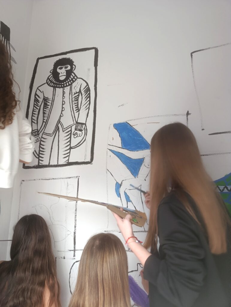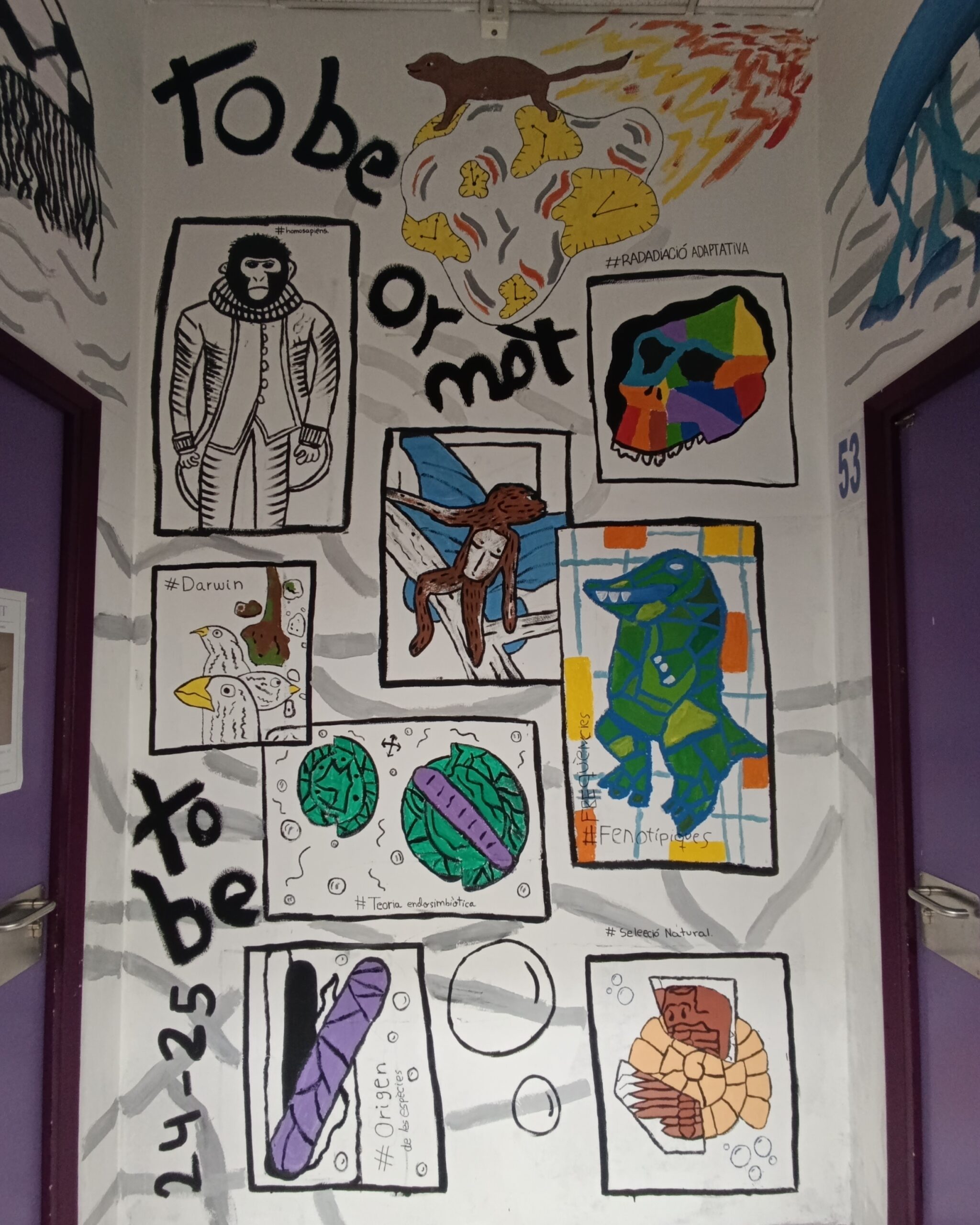 Els del projecte To be or not to be han hagut d’endinsar-se a la història de l’art i al model evolució per poder crear un mural pintat al centre. Portaven vàries setmanes de treball conceptual i aquests darrers dies l’han pogut plasmar fent un mural cooperatiu.