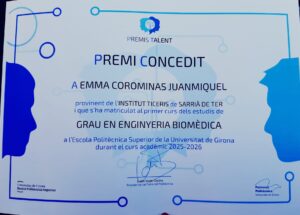 El passat dijous, l’Emma Corominas Juanmiquel, exalumna de la nostra primera promoció, va rebre el Premi Talent que atorga el Patronat de l’Escola Politècnica Superior de la UdG i que distingeix els estudiants de nou accés amb la millor nota d’ingrés procedents de Batxillerat i Cicles Formatius.