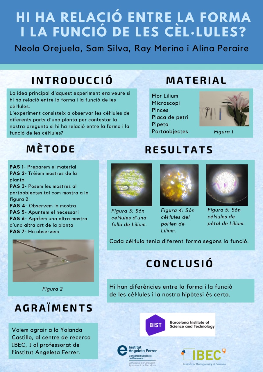 Una exhibició pública del projecte on l’alumnat de 1r d’ESO va presentar els seus pòsters científics i les entrevistes realitzades als investigadors i investigadores dels centres de recerca IBEC, IFAE, IRB.