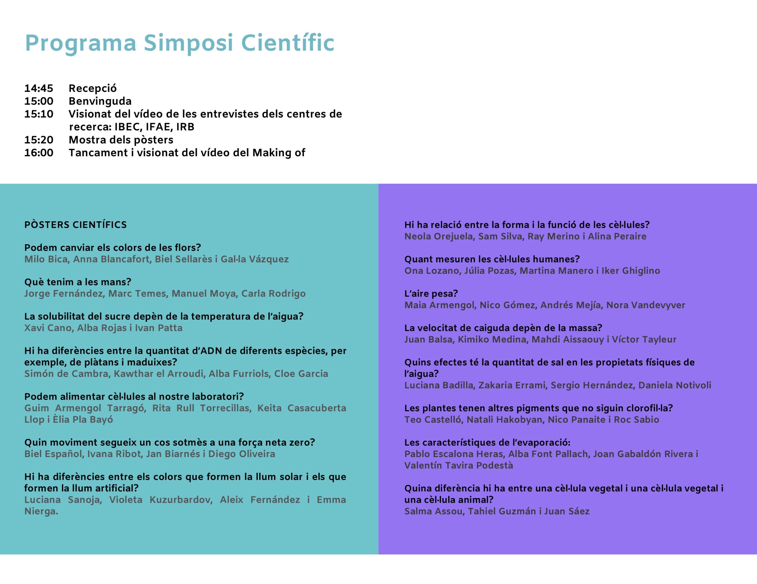 Durant el simposi l’alumnat també va presentar els seus pòsters científics, una creació realitzada per explicar l’experiment científic realitzat durant el projecte.