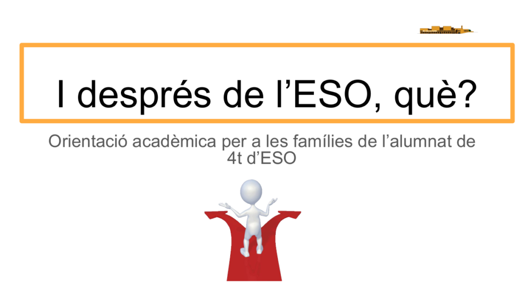Ahir dilluns vam fer una reunió al gimnàs destinada a les famílies de l’alumnat de 4t d’ESO sobre què estudiar un cop acabada l’ESO. Us deixem la presentació multimèdia que vam utilitzar a