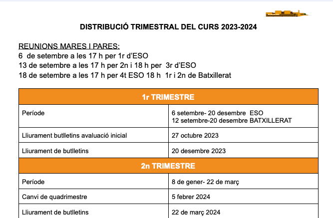 DISTRIBUCIÓ TRIMESTRAL DEL CURS 2023-2024