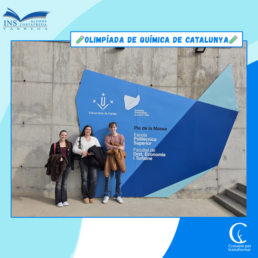 El dimecres 11 de febrero, els alumnes de 2n de Batxillerat, Marcel Bascuñana Pascual, Raquel Boqué Carbonell i Julia Patricia Ghircau van participar en la XXXIX Olimpíada de Química de Catalunya i ho van fer al Campus d’Igualada de la Universitat de Lleida 🎓. La prova, que consistia en un qüestionari de 10 preguntes, es […]