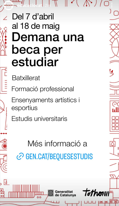Us informem s’ha publicat al BOE l’extracte de la Resolució de 24 de març de 2026, per la que es convoquen els ajuts per a alumnat d’estudis postobligatoris per al curs 2026-2027. Els terminis seran des del dia 7 d’abril fins el de 18 maig de 2026 a les 15:00 (hora peninsular). La beca s’ha […]