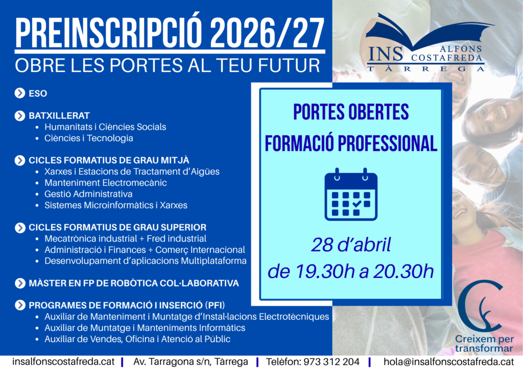 📢 El proper dia 28 d’abril a les 19:30h es realitza la jornada de portes Obertes de Cicles Formatius a l’INS Alfons Costafreda de Tàrrega on podreu conèixer les instal·lacions del centre i la nostra l’oferta educativa sobre Cicles Formatius.