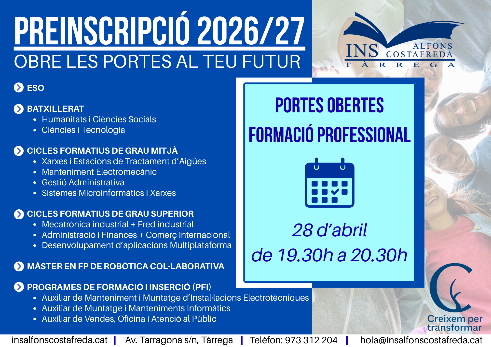 📢 El proper dia 28 d’abril a les 19:30h es realitza la jornada de portes Obertes de Cicles Formatius a l’INS Alfons Costafreda de Tàrrega on podreu conèixer les instal·lacions del centre i la nostra l’oferta educativa sobre Cicles Formatius. 📝Per a una millor organització de la visita i orientació al cicle d’interès us podeu […]