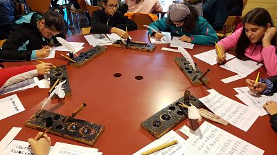 A l’Scriptorium han fet un taller d’escriptura amb diferents tipus de plomes, s’han posat a la pell dels monjos escribans i s’han endut el seu punt de llibre!