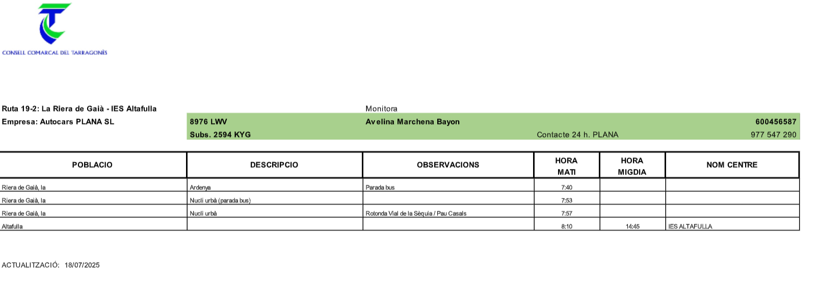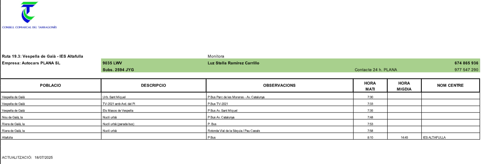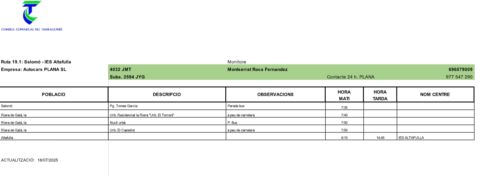 Podeu trobar els horaris del servei d’autocars per al curs 2025-2026 a l’apartat menu/serveis/transport . Enllaç directe