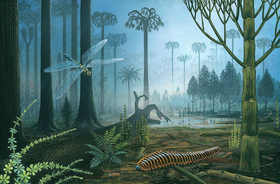 A més, hi ha alta concentració d’oxigen a l’atmosfera (un 35% quan ara hi ha un 21%), i apareixen insectes molt grans (libèl·lules de 60 cm) i arbres poden arribar fins als 40 mestres, com el Lepidodendron.