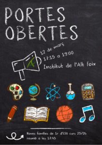 El dimecres 12 de març, des de les 17.15 fins a les 19 h, es farà la Jornada de portes obertes per tal que les famílies interessades a matricular les seves filles o els seus fills per primer cop a l’Institut tinguin l’oportunitat de conèixer el nostre projecte educatiu i les instal·lacions de què disposem. Diversos grups d’alumnat voluntari les acompanyaran en una visita guiada i l’equip directiu oferirà una xerrada informativa sobre el funcionament del centre.