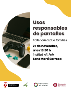 El proper dijous dia 27/11 a les 18.30 es farà a l’Institut un taller sobre “Usos responsables de les pantalles”, a càrrec de professionals del Consell comarcal de l’Alt Penedès.