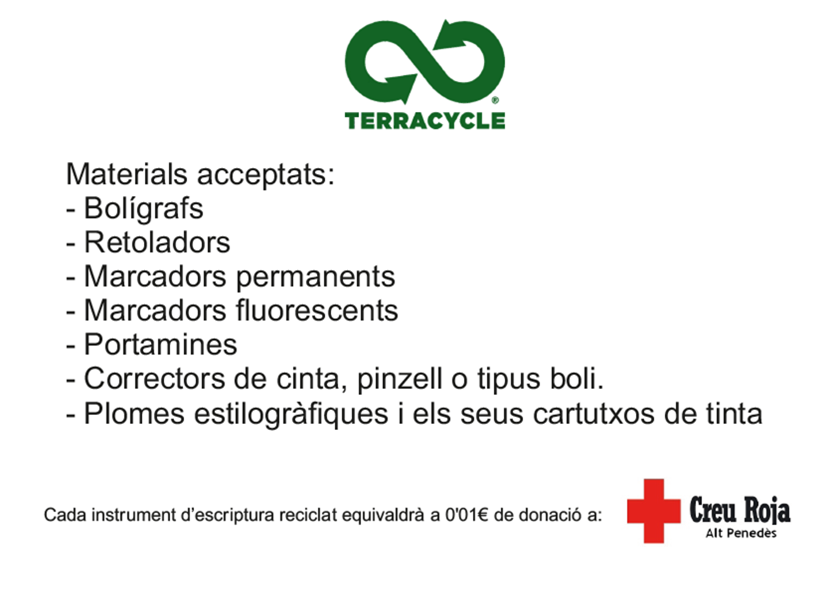 Us volem explicar que els alumnes de la Siei, hem fet un passaclasses per tots els cursos informant en que consisteix el projecte de Terracycle. Com ja sabeu, tan l’alumnat com el professorat podeu reciclar el material escolar gastat i desar-lo en la capsa que nosaltres mateixos hem pintat. Amb aquesta acció, a més de reciclar, estarem donant una ajuda solidària a la Creu Roja (1 cèntim per material desat). No sembla gaire però si sumem cèntim a cèntim pels diferents instituts on s’aplica aquest projecte, al final suma un bon munt!!! Així que ja sabeu, quan s’us gasti el bolígraf no el llenceu a la brossa, recicleu-lo!